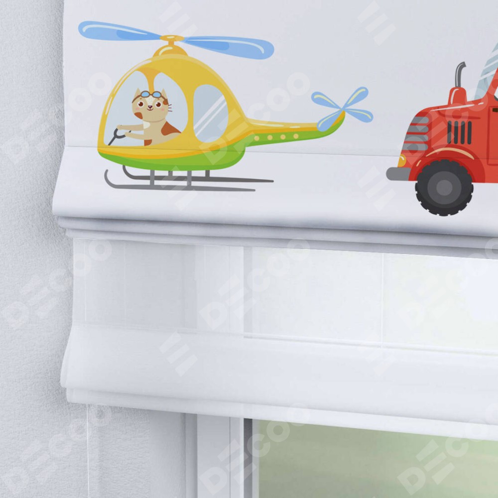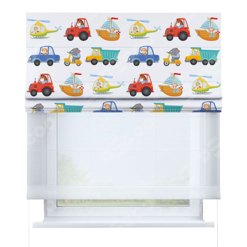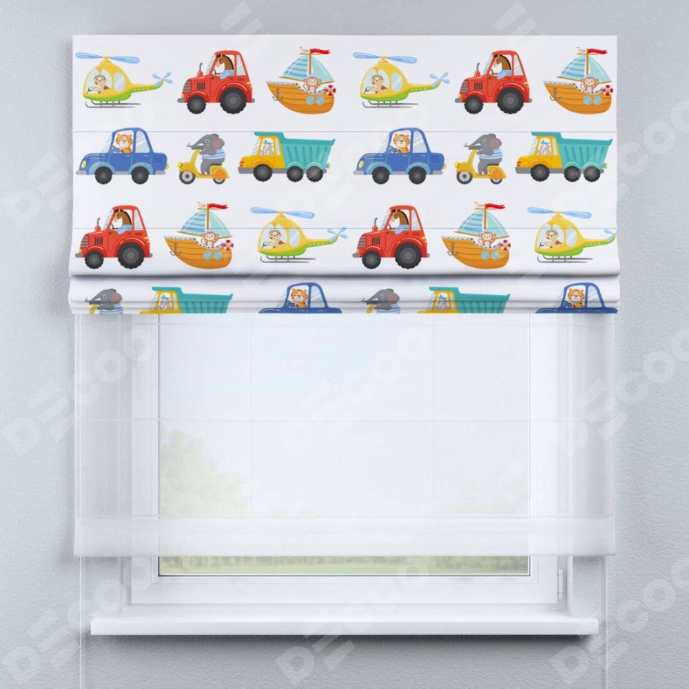 Римская штора день-ночь производителя «Cortin», используется для проёма, пошита из двух полотен, с лицевой блэкаут с нанесением сублимационной печати «Увлекательная поездка», вторая ткань тюль (по стандарту комплектуется тюль белого цвета артикул V-01). Имеет универсальный механизм и подходит для монтажа: на потолок, на стену и в нишу.