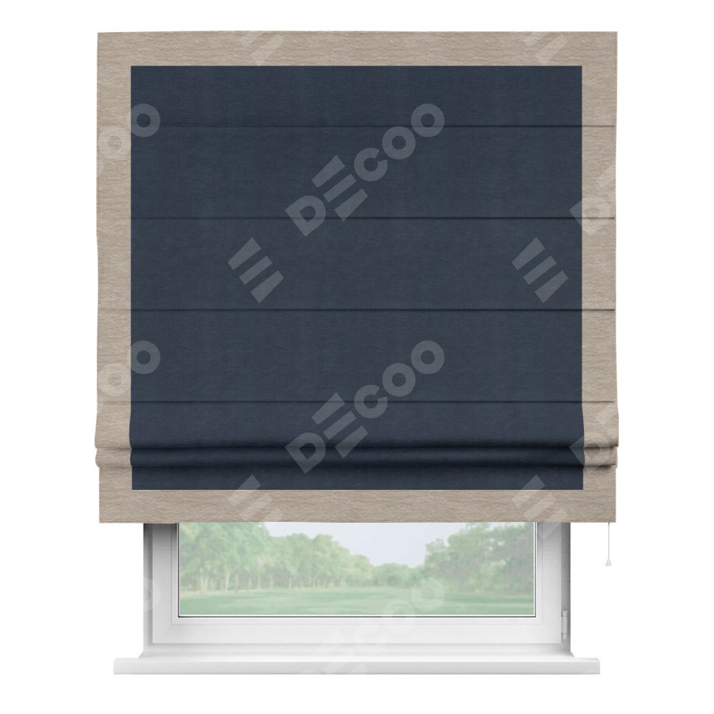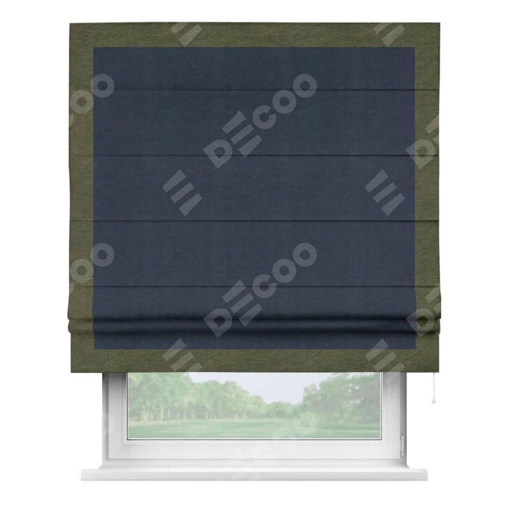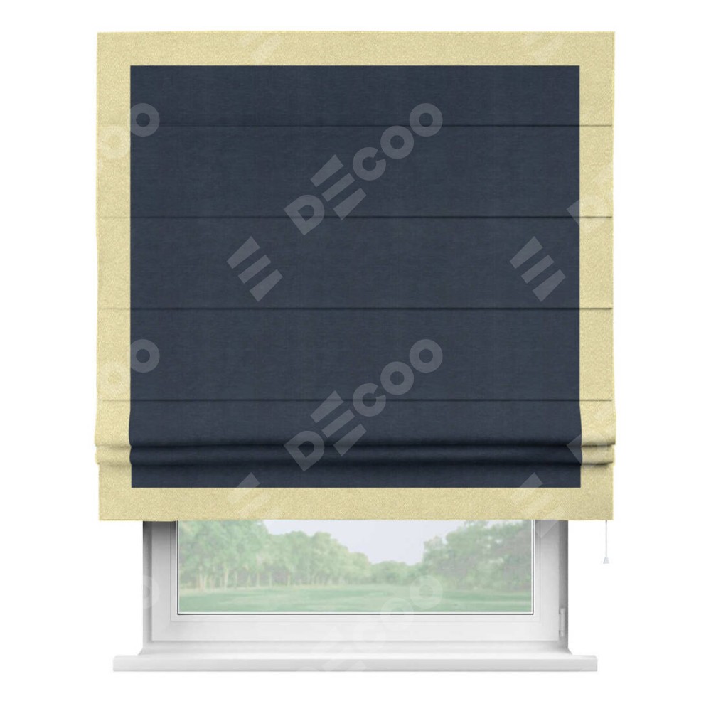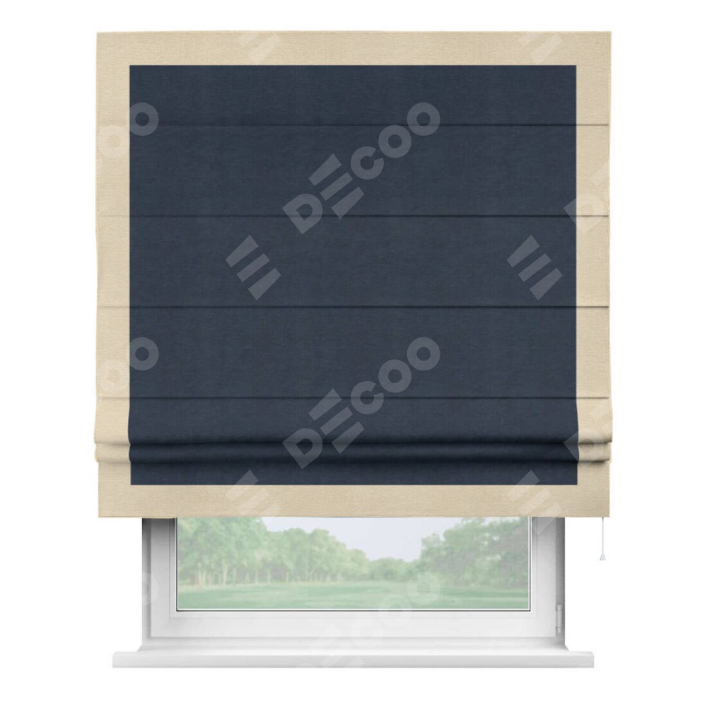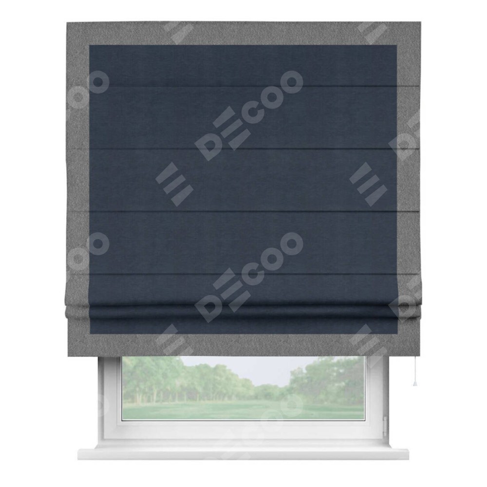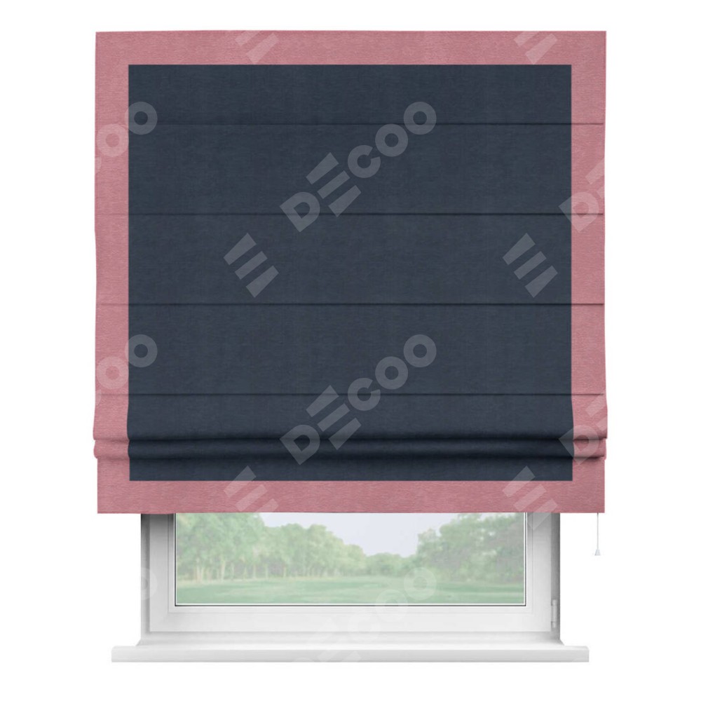 Римская штора производителя «Cortin», используется для проёма, пошита из ткани софт однотонный тёмно-синий, артикул 33111. Отделка шторы кантом «Чесс», ткань для канта используется из софта разной расцветки на выбор. Имеет универсальный механизм и подходит для монтажа: на потолок, на стену и в нишу.