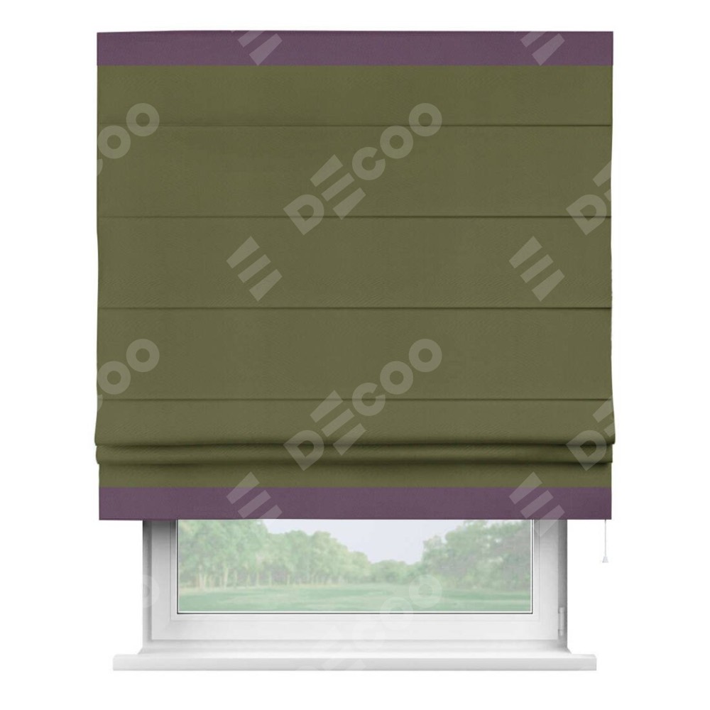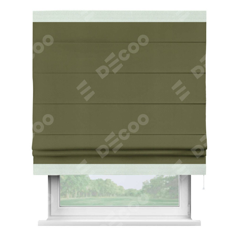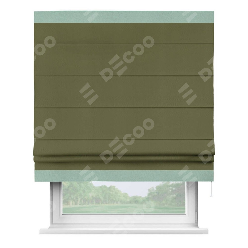 Римская штора производителя «Cortin», используется для проёма, пошита из ткани блэкаут однотонный зелёный, артикул ткани 81859. Отделка шторы кантом «Горизонт», ткань для канта используется из блэкаута однотонного разной расцветки на выбор. Имеет универсальный механизм и подходит для монтажа: на потолок, на стену и в нишу.