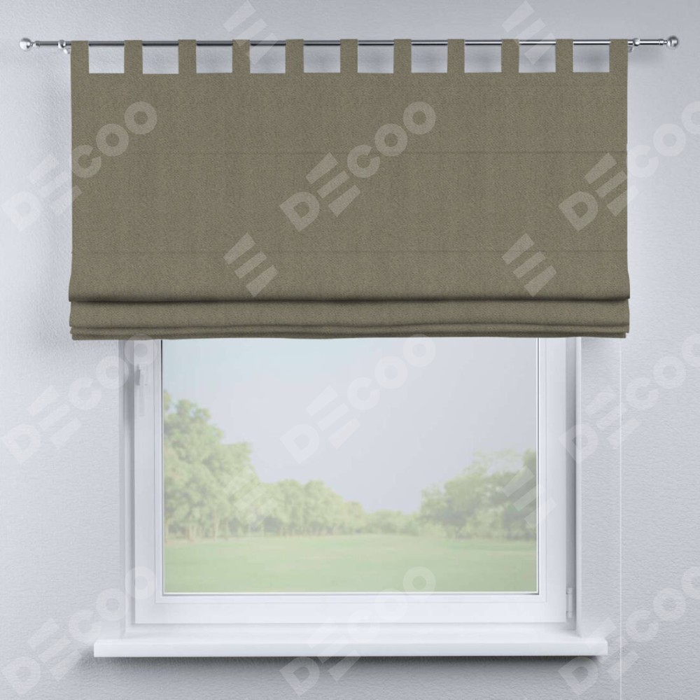 Римская штора производителя «Cortin», используется для проёма, пошита из ткани блэкаут тиснение с блеском графитовый, артикул ткани 34648. Изнаночная сторона материала черного цвета, что обеспечивает необходимую светонепроницаемость. Данная модель пошита на петлях, комплектуется на выбор круглым карнизом и подходит для монтажа на стену. Римская штора на петлях имеет простую систему регулировки высоты, отличительным преимуществом данной модели является простой способ монтажа. Достаточно повесить ее на трубу и штора готова!