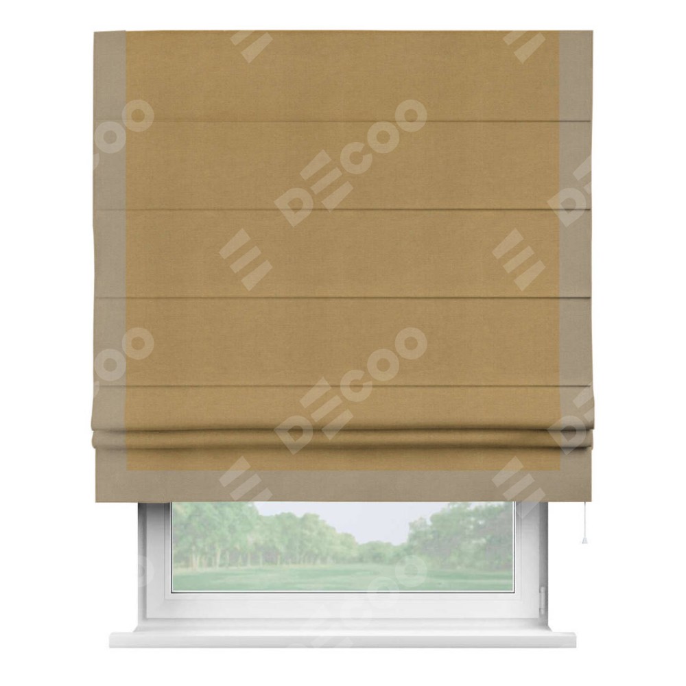 Римская штора производителя «Cortin», используется для проёма, пошита из ткани вельвет горчица, артикул ткани 17760. Отделка шторы кантом «Виктория», ткань для канта используется из вельвета разной расцветки на выбор. Имеет универсальный механизм и подходит для монтажа: на потолок, на стену и в нишу.