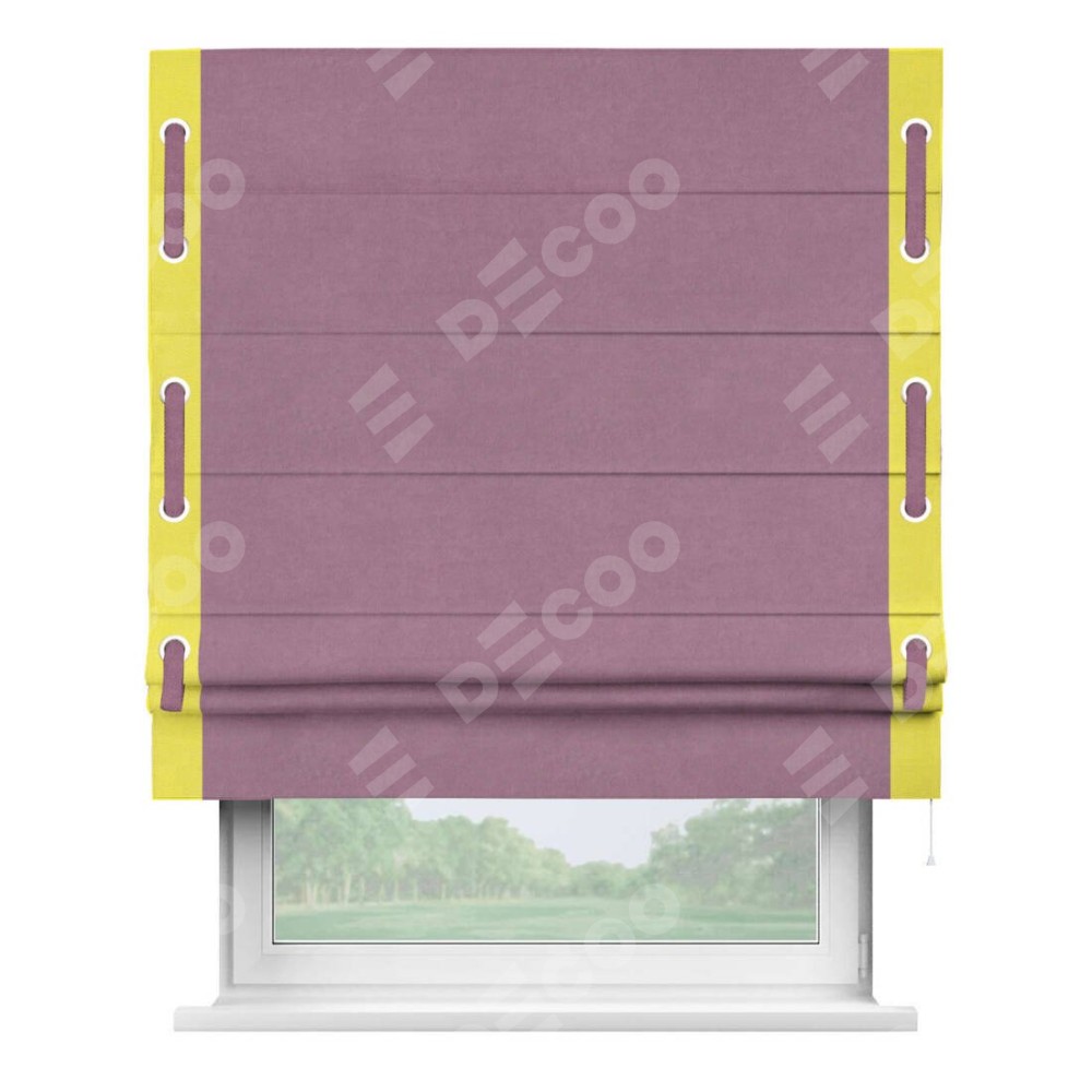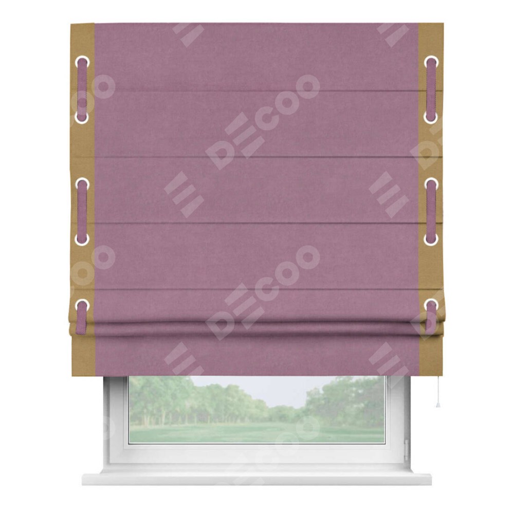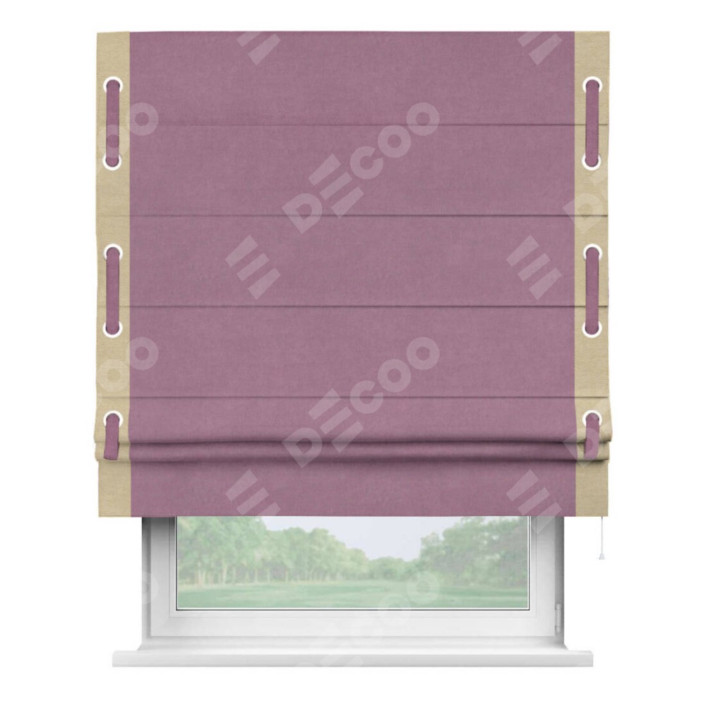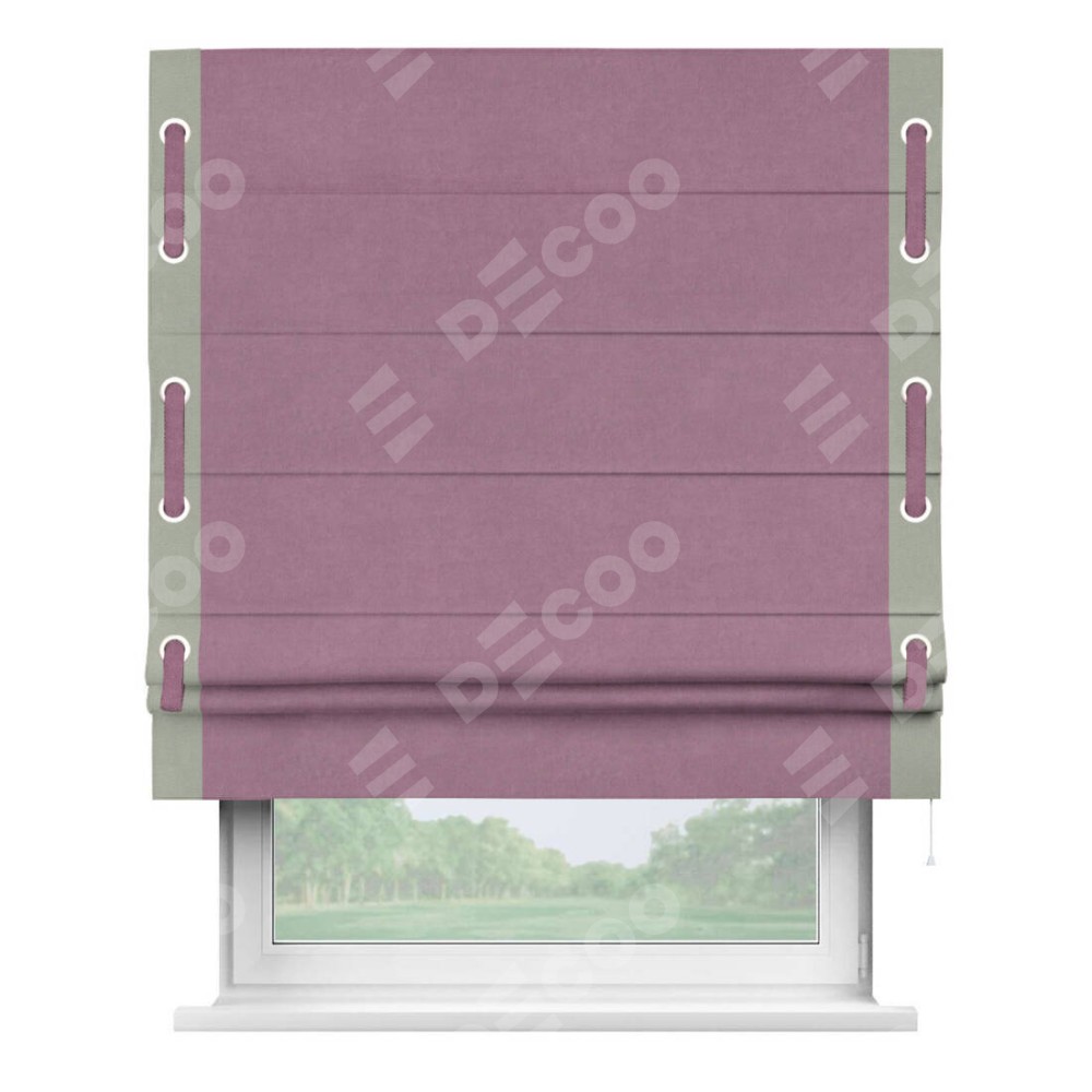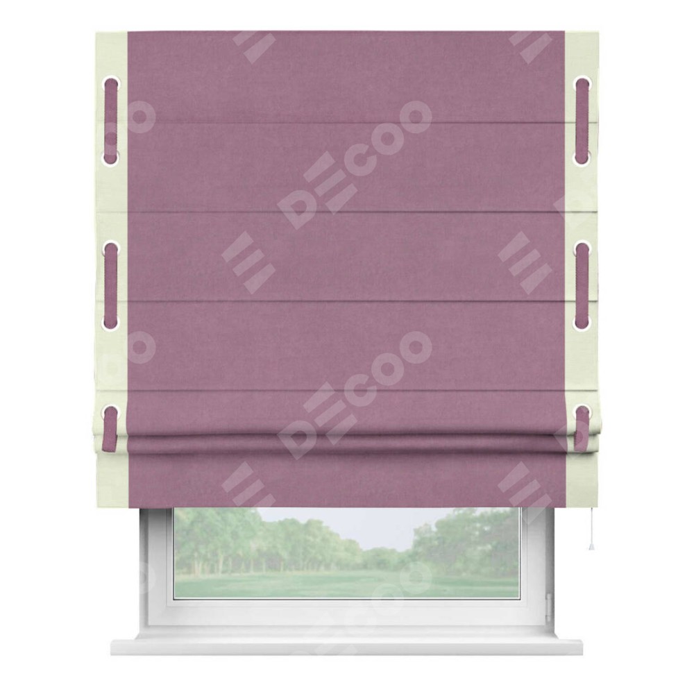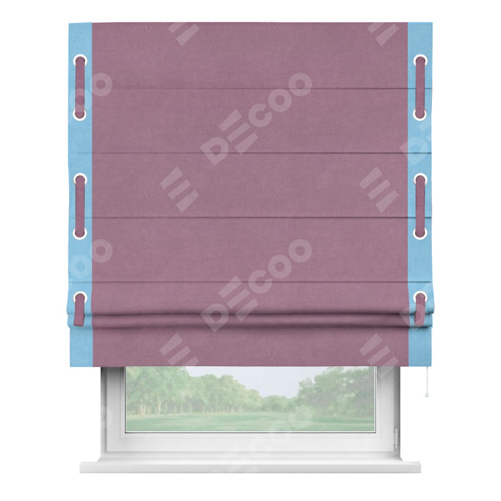 Римская штора производителя «Cortin», используется для проёма, пошита из ткани вельвет лиловый, артикул ткани 17752. Отделка шторы кантом «Стрим Дуо» на кантах расположены люверсы с пояском, ткань для канта используется из вельвета разной расцветки на выбор. Ткань для пояска обычно используется из основной ткани шторы, а так же можно сделать из любой расцветки по желанию. Имеет универсальный механизм и подходит для монтажа: на потолок, на стену и в нишу.