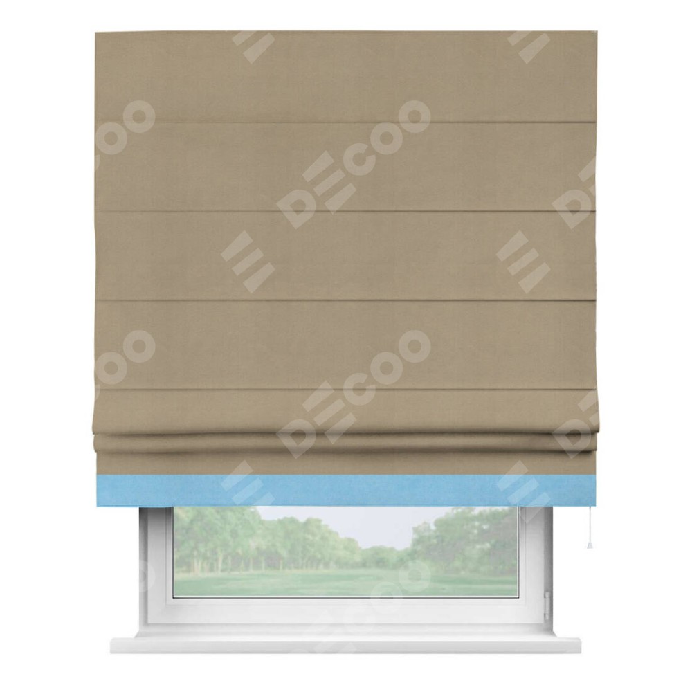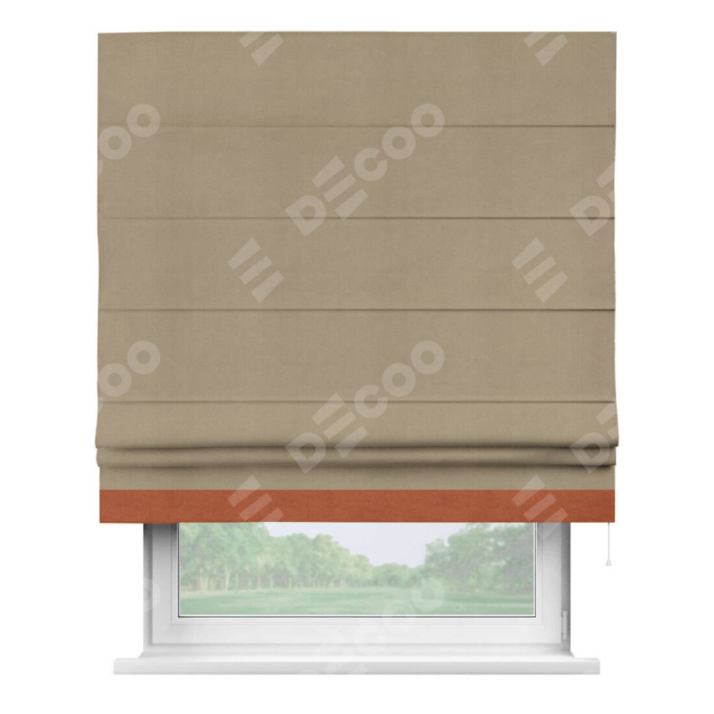 Римская штора производителя «Cortin», используется для проёма, пошита из ткани вельвет кофейный, артикул ткани 30980. Отделка шторы кантом «Джестер», ткань для канта используется из вельвета разной расцветки на выбор. Имеет универсальный механизм и подходит для монтажа: на потолок, на стену и в нишу.