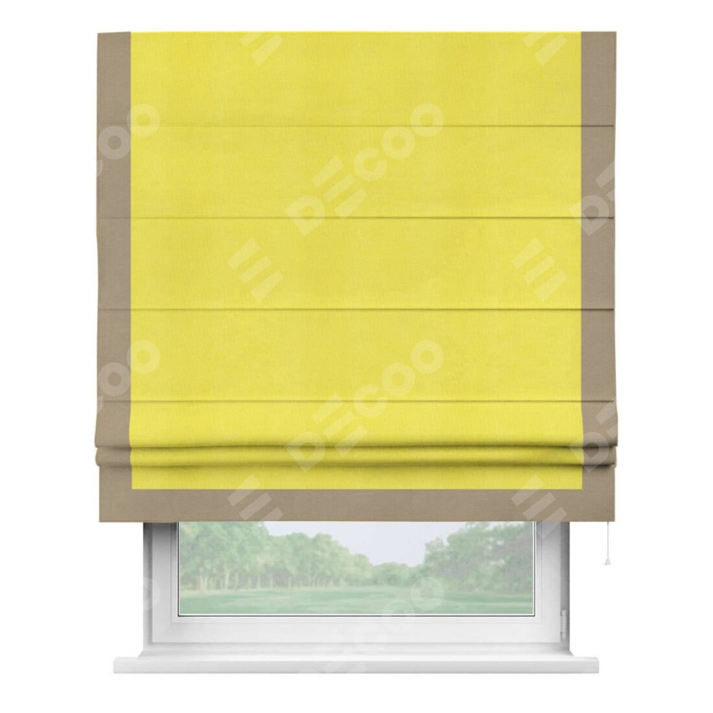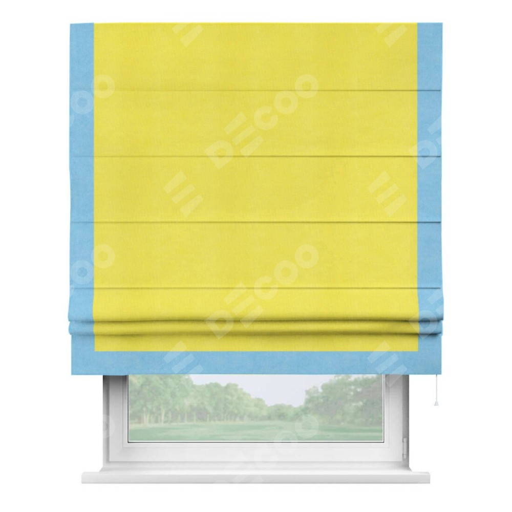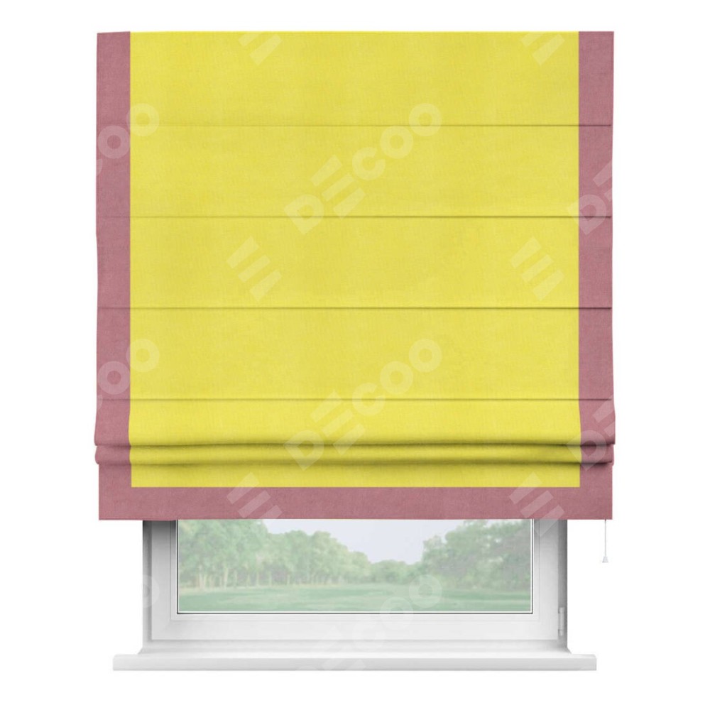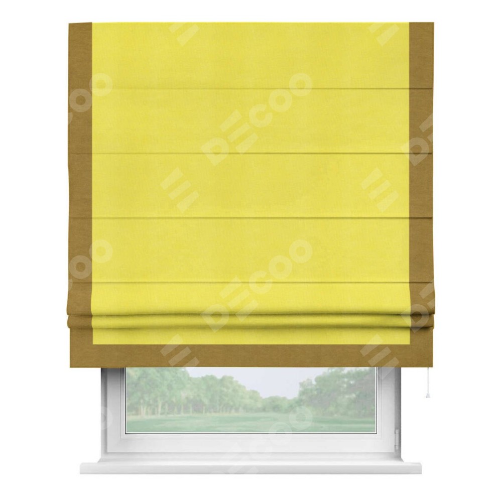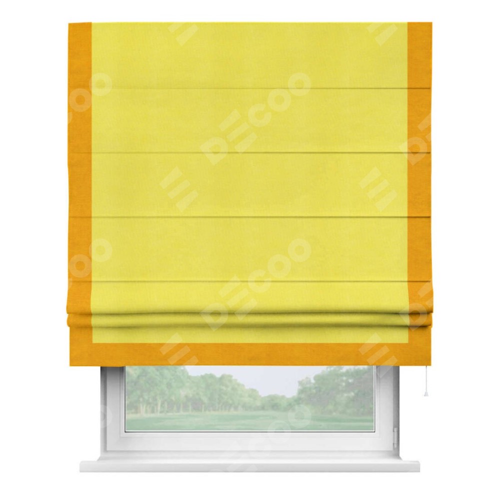 Римская штора производителя «Cortin», используется для проёма, пошита из ткани вельвет cветло-желтый, артикул ткани 30997. Отделка шторы кантом «Виктория», ткань для канта используется из вельвета разной расцветки на выбор. Имеет универсальный механизм и подходит для монтажа: на потолок, на стену и в нишу.
