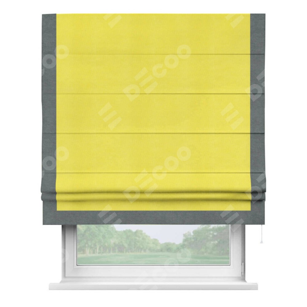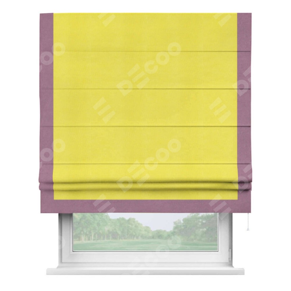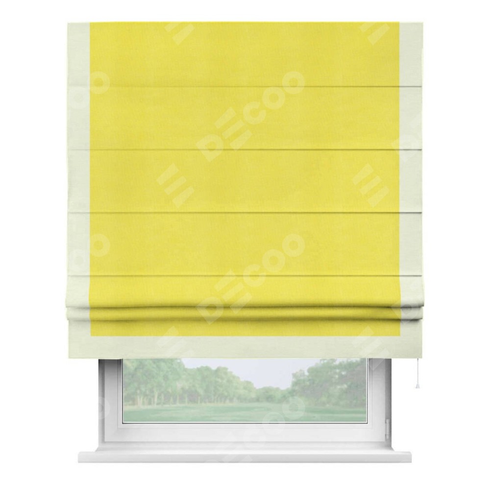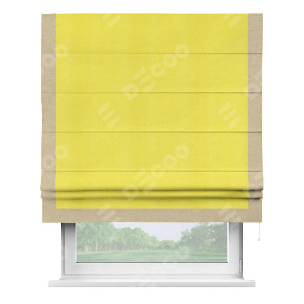 Римская штора производителя «Cortin», используется для проёма, пошита из ткани вельвет cветло-желтый, артикул ткани 30997. Отделка шторы кантом «Виктория», ткань для канта используется из вельвета разной расцветки на выбор. Имеет универсальный механизм и подходит для монтажа: на потолок, на стену и в нишу.
