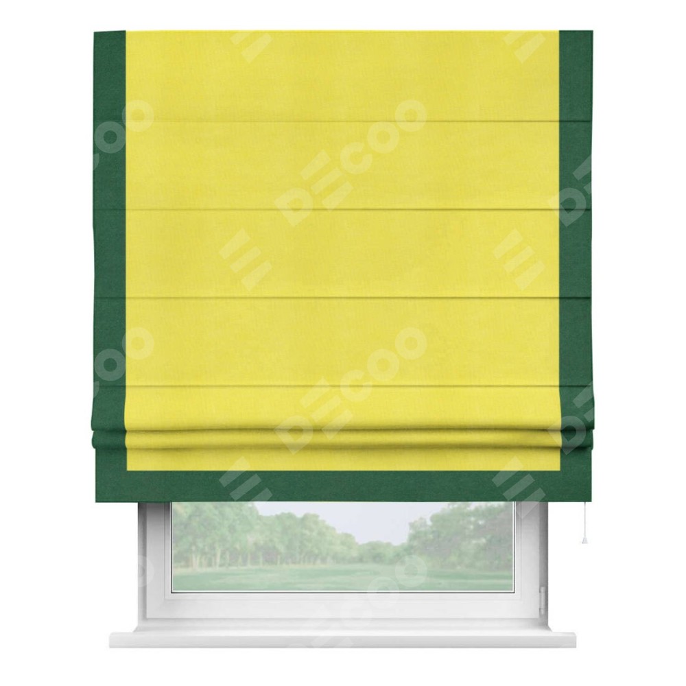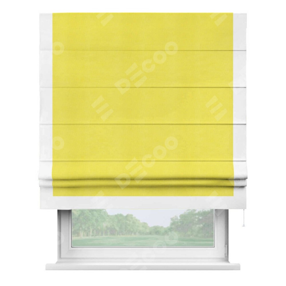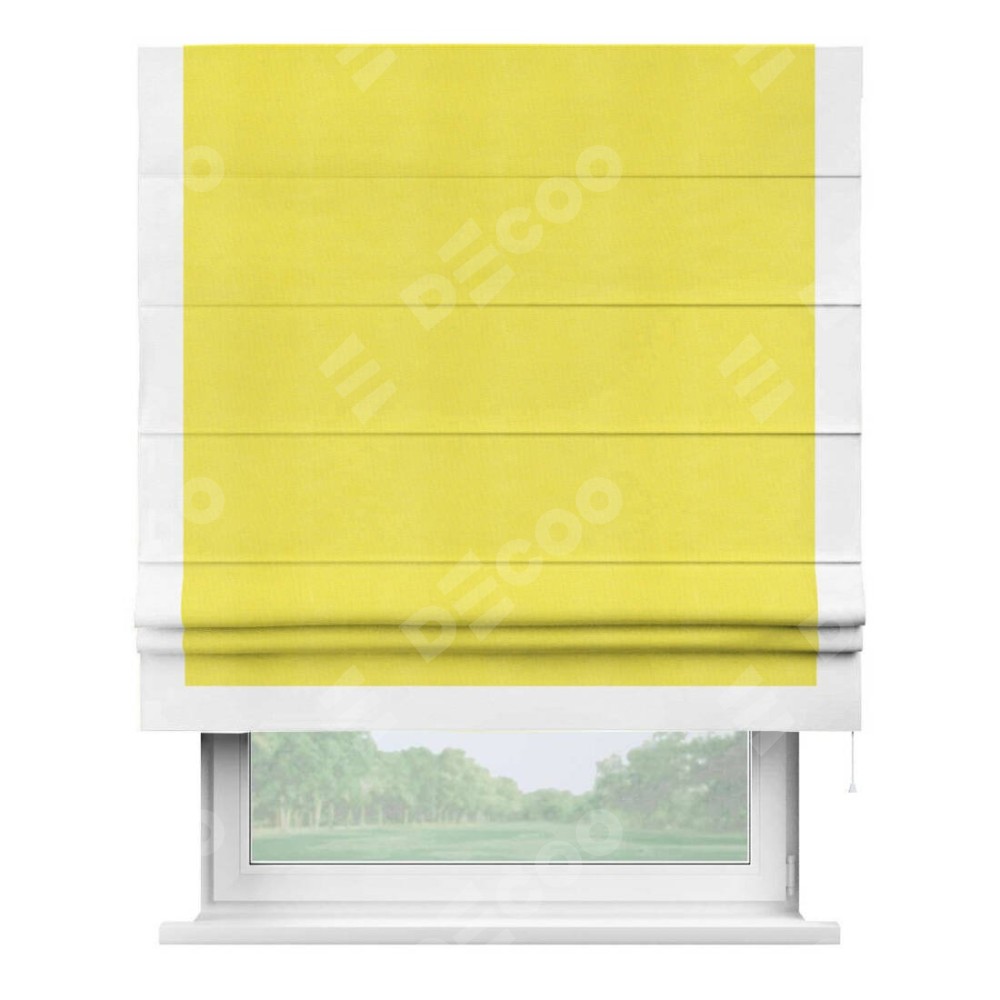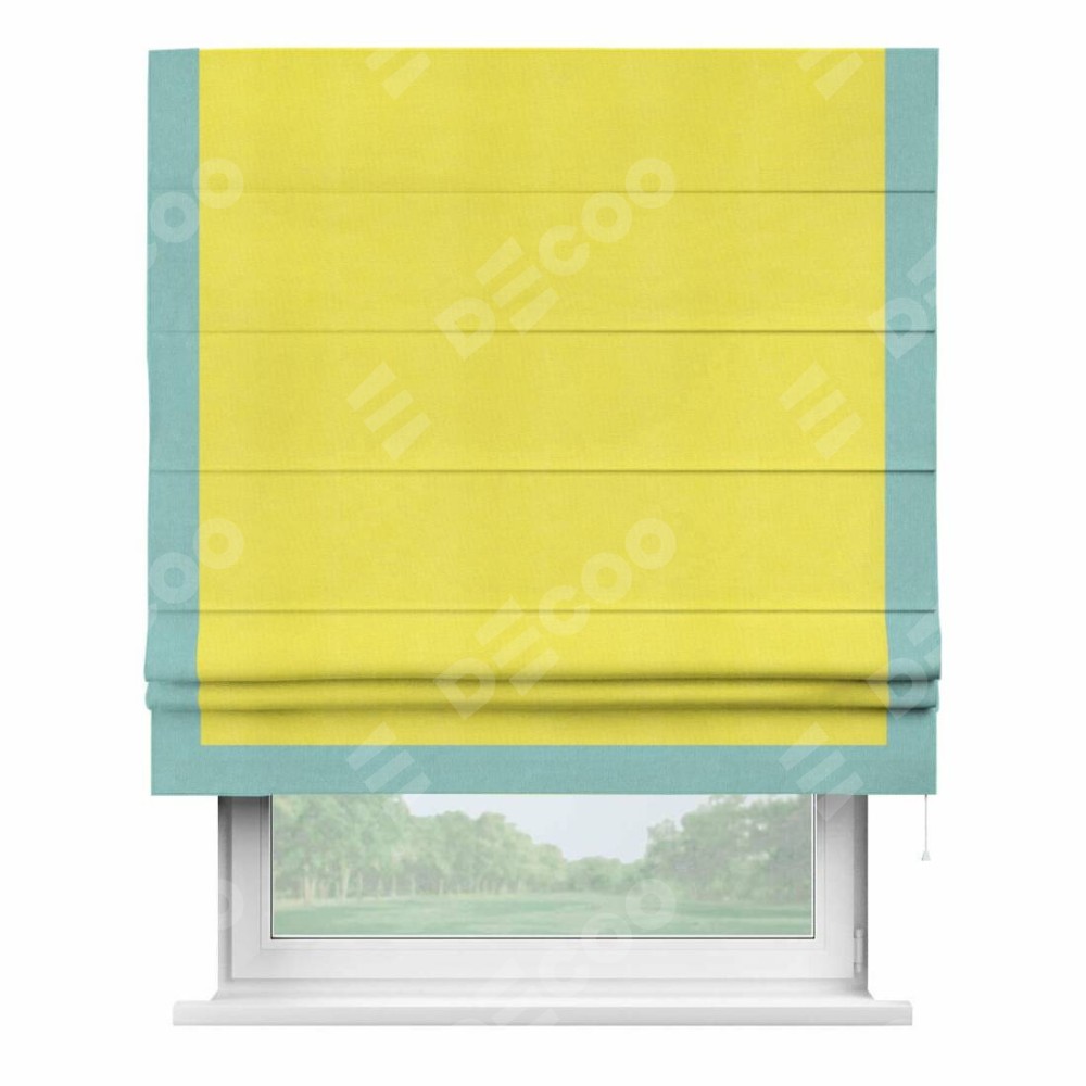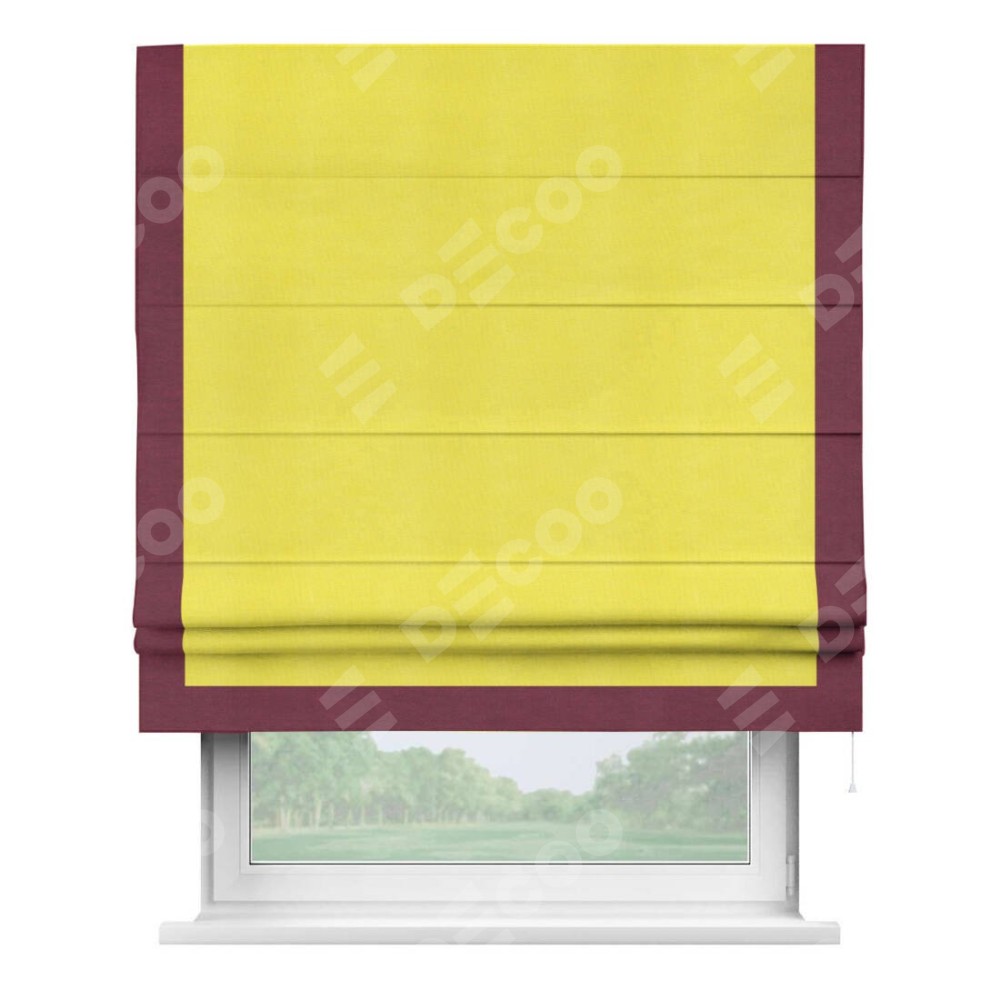 Римская штора производителя «Cortin», используется для проёма, пошита из ткани вельвет cветло-желтый, артикул ткани 30997. Отделка шторы кантом «Виктория», ткань для канта используется из вельвета разной расцветки на выбор. Имеет универсальный механизм и подходит для монтажа: на потолок, на стену и в нишу.
