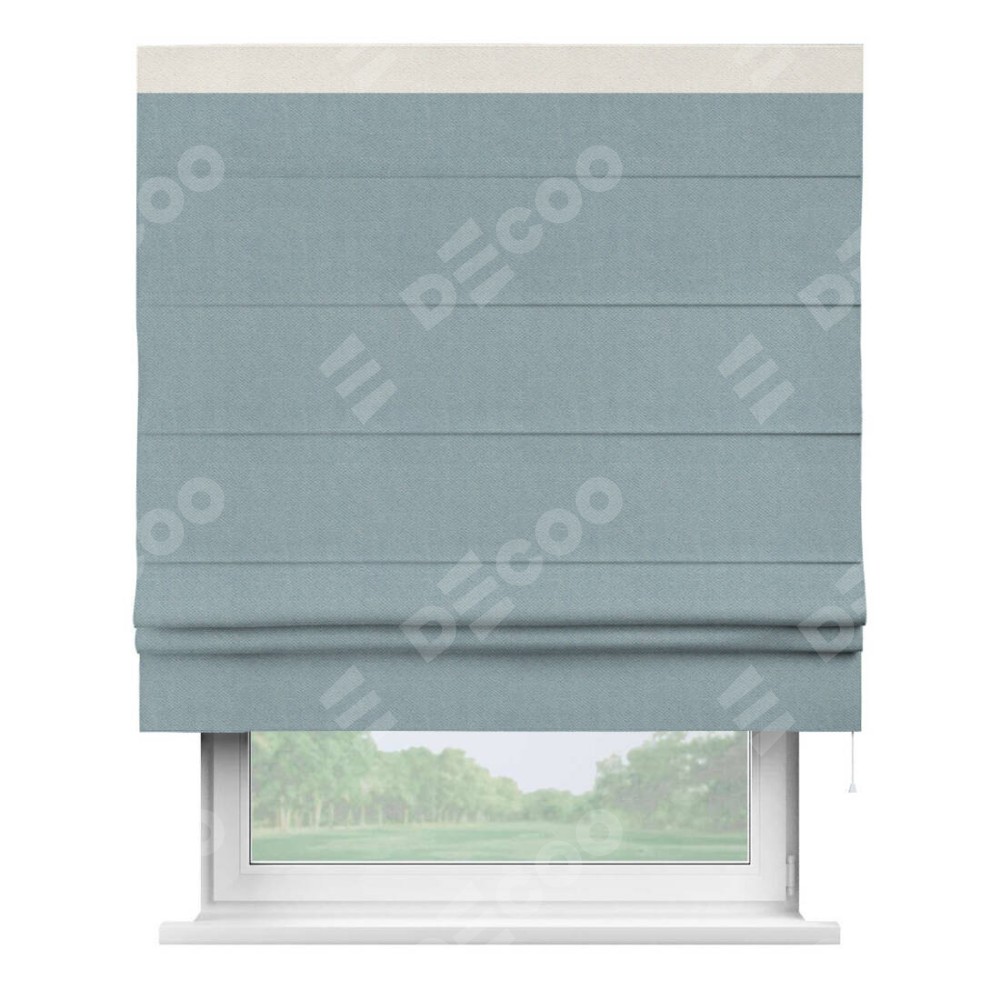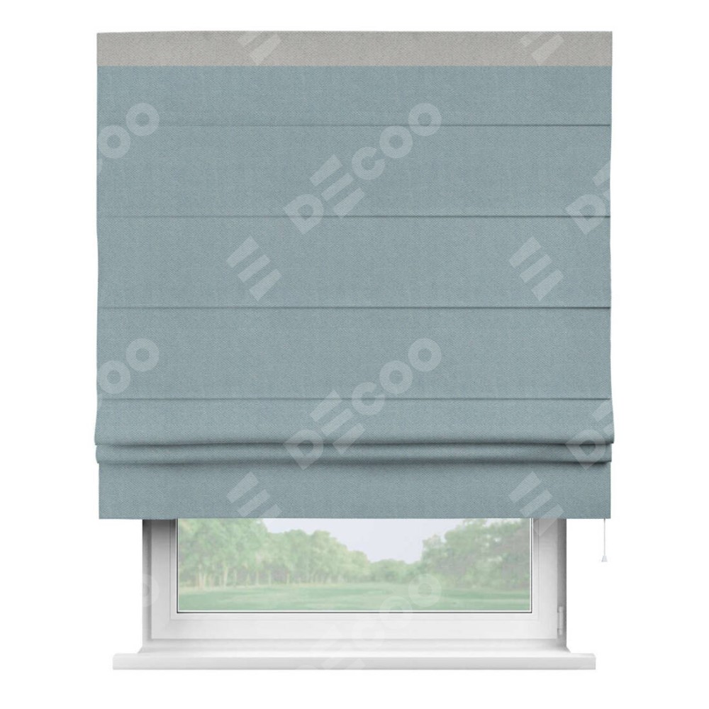 Римская штора производителя «Cortin», используется для проёма, пошита из ткани блэкаут с блеском синий, артикул 34625. Отделка шторы кантом «Кинг», ткань для канта используется из блэкаута с блеском разной расцветки на выбор. Изнаночная сторона материала черного цвета, что обеспечивает необходимую светонепроницаемость. Имеет универсальный механизм и подходит для монтажа: на потолок, на стену и в нишу.
