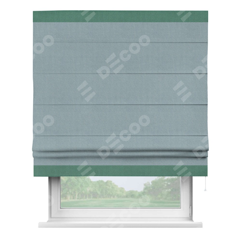 Римская штора производителя «Cortin», используется для проёма, пошита из ткани блэкаут с блеском синий, артикул 34625. Отделка шторы кантом «Горизонт», ткань для канта используется из блэкаута с блеском разной расцветки на выбор. Изнаночная сторона материала черного цвета, что обеспечивает необходимую светонепроницаемость. Имеет универсальный механизм и подходит для монтажа: на потолок, на стену и в нишу.