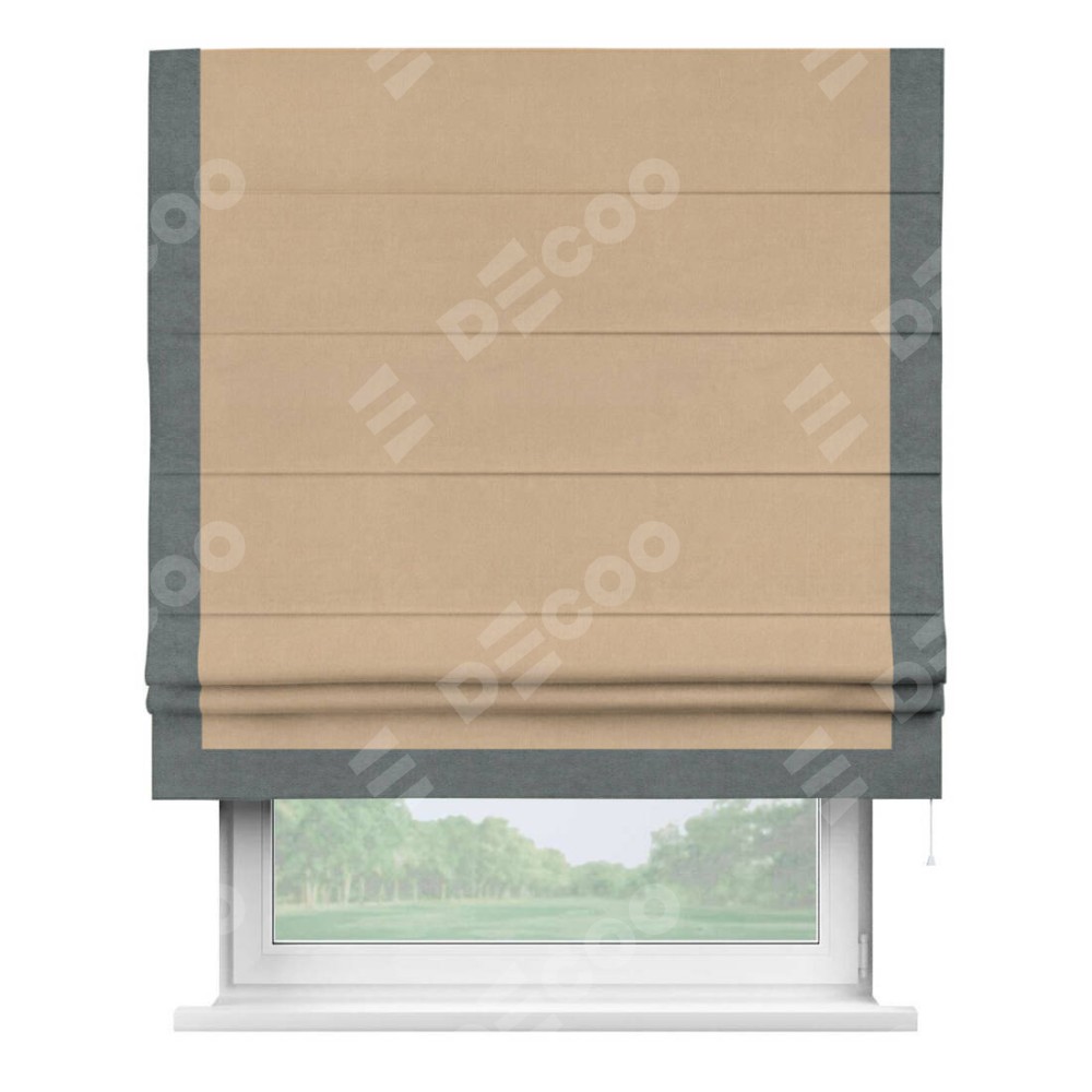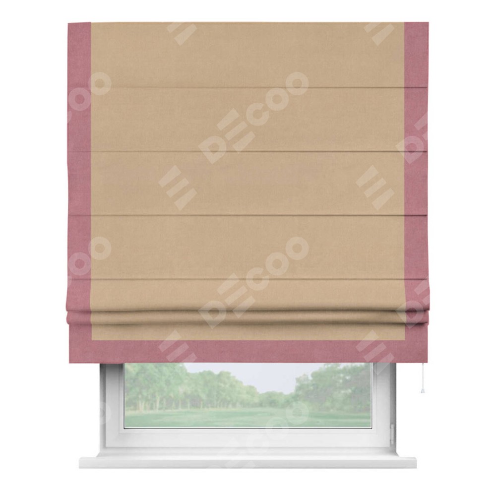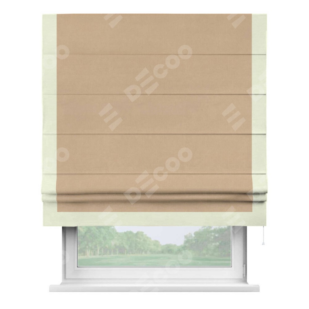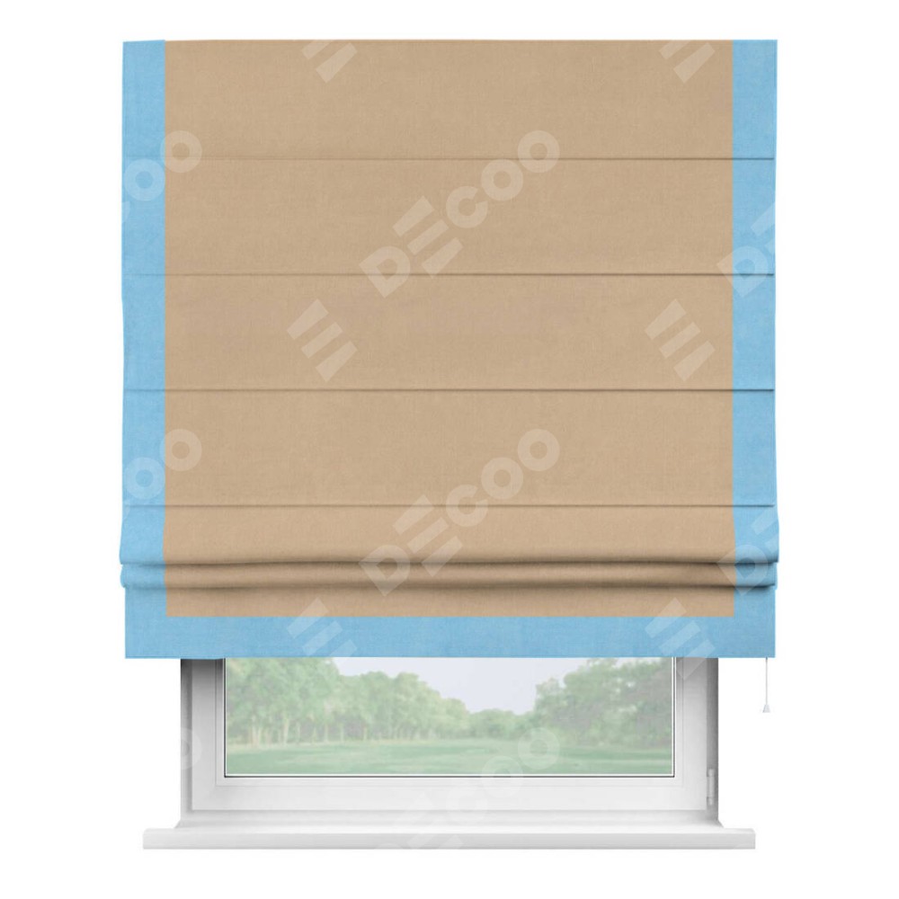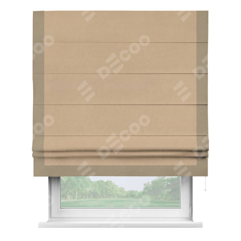 Римская штора производителя «Cortin», используется для проёма, пошита из ткани вельвет песочный, артикул ткани 17740. Отделка шторы кантом «Виктория», ткань для канта используется из вельвета разной расцветки на выбор. Имеет универсальный механизм и подходит для монтажа: на потолок, на стену и в нишу.