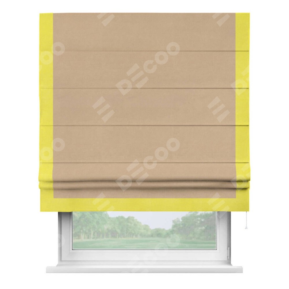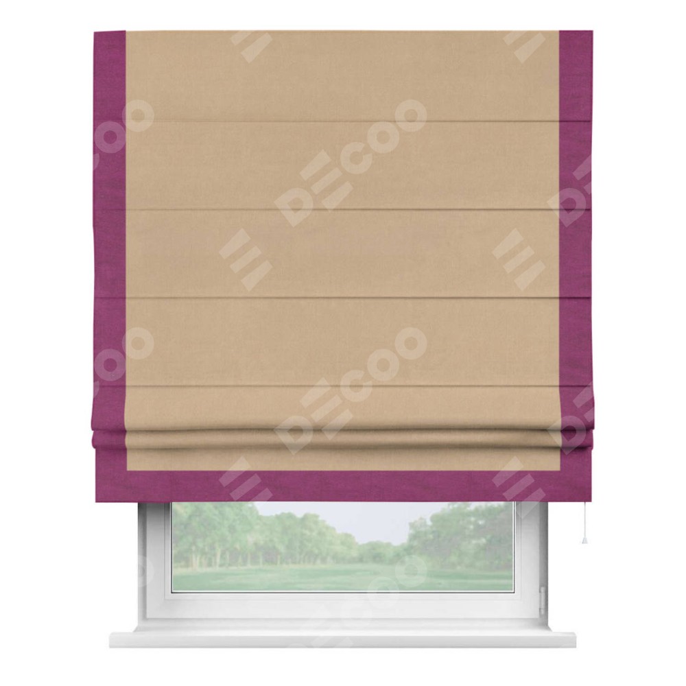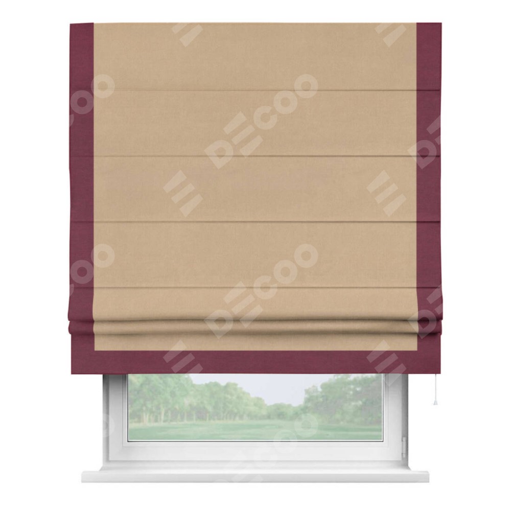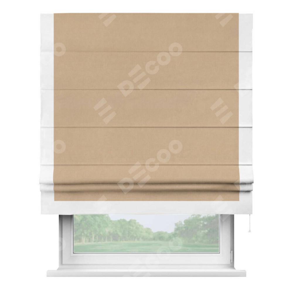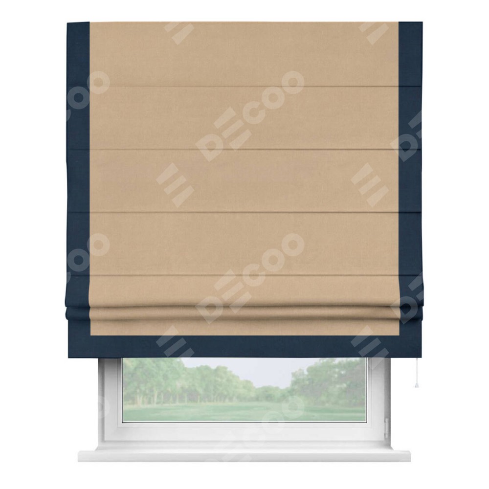 Римская штора производителя «Cortin», используется для проёма, пошита из ткани вельвет песочный, артикул ткани 17740. Отделка шторы кантом «Виктория», ткань для канта используется из вельвета разной расцветки на выбор. Имеет универсальный механизм и подходит для монтажа: на потолок, на стену и в нишу.