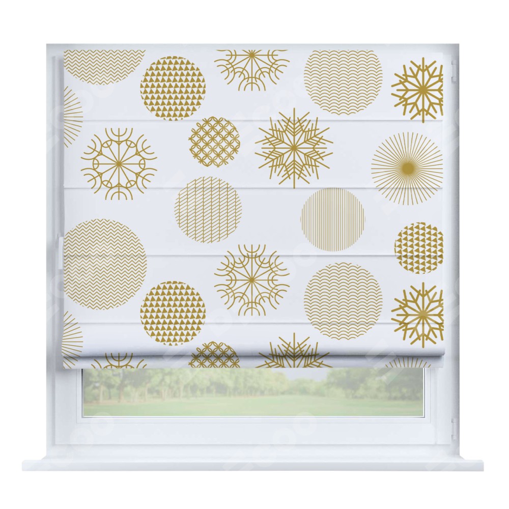 Римская штора производителя «Cortin», устанавливается на створку окна, пошита из ткани блэкаут с нанесением сублимационной печати «Золотые шары». Штора шьётся по индивидуальным размерам, для данного типа римской шторы возможная ширина от 35 до 150 см., высота до 250 см.
