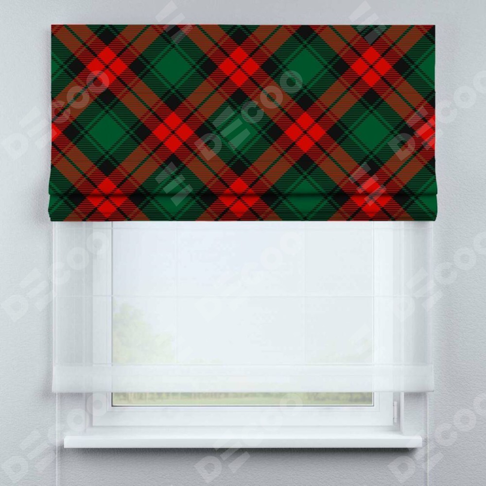 Римская штора день-ночь производителя «Cortin», используется для проёма, пошита из двух полотен, с лицевой блэкаут с нанесением сублимационной печати «Красно-зелёная клетка», вторая ткань тюль (по стандарту комплектуется тюль белого цвета артикул V-01). Имеет универсальный механизм и подходит для монтажа: на потолок, на стену и в нишу.