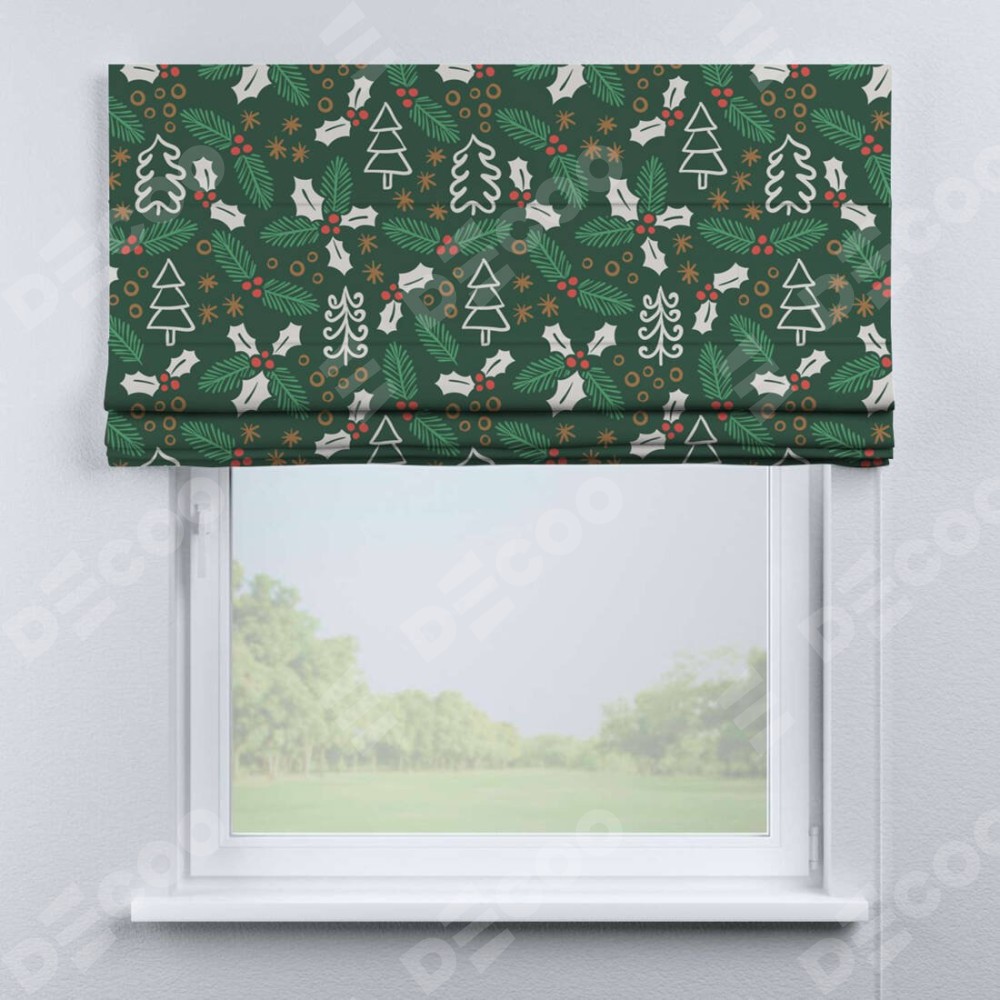 Римская штора производителя «Cortin», используется для проёма, пошита из ткани блэкаут с нанесением сублимационной печати «Рождественский узор». Имеет универсальный механизм и подходит для монтажа: на потолок, на стену и в нишу.