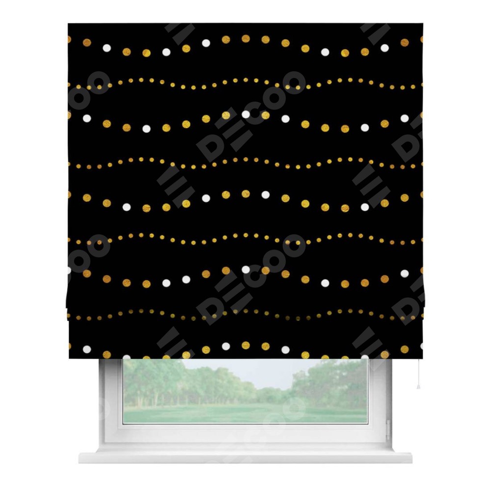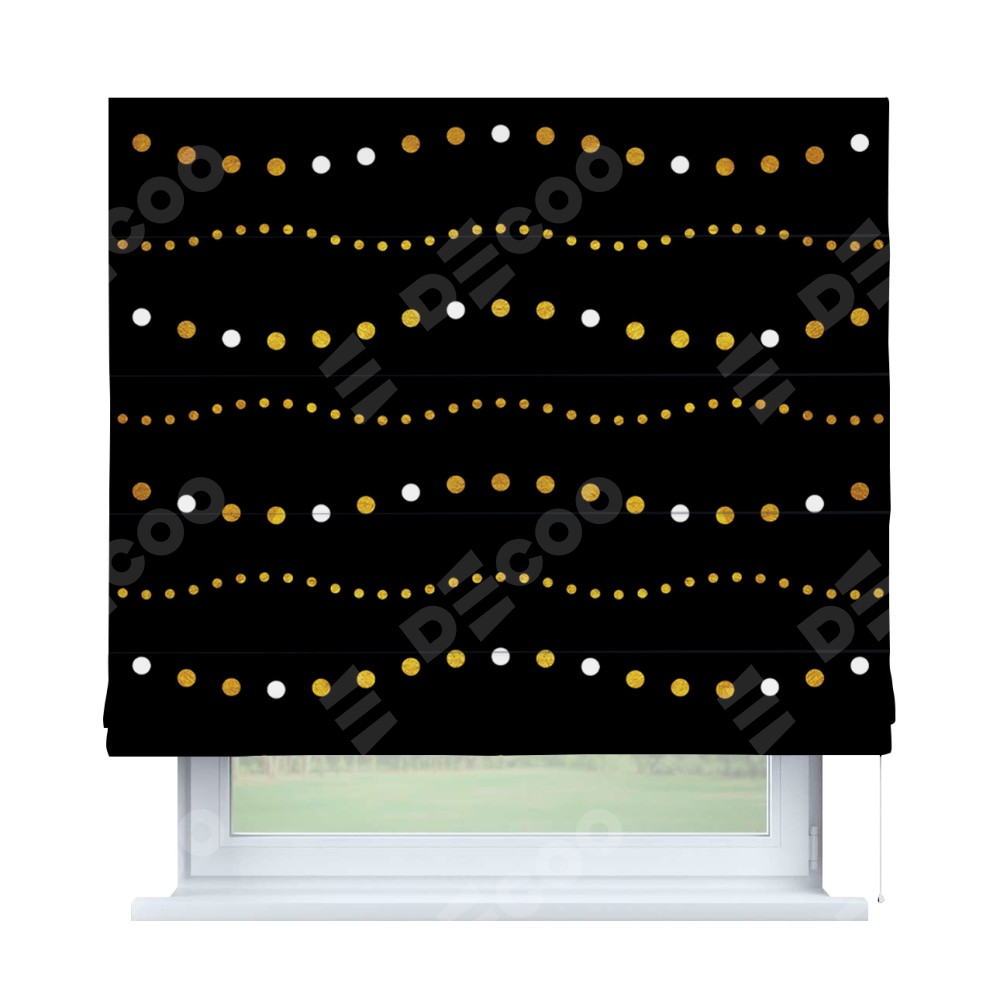 Римская штора производителя «Cortin», используется для проёма, пошита из ткани блэкаут с нанесением сублимационной печати «Яркие огоньки». Имеет универсальный механизм и подходит для монтажа: на потолок, на стену и в нишу.