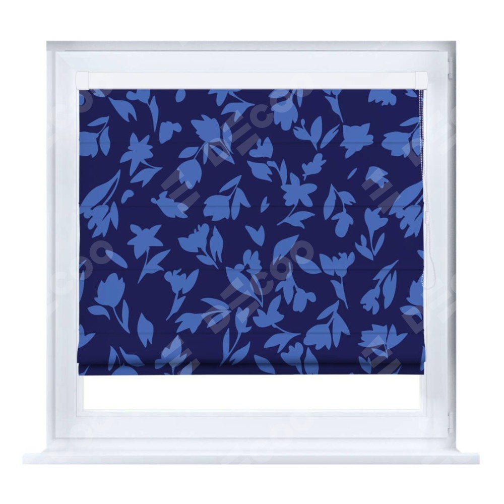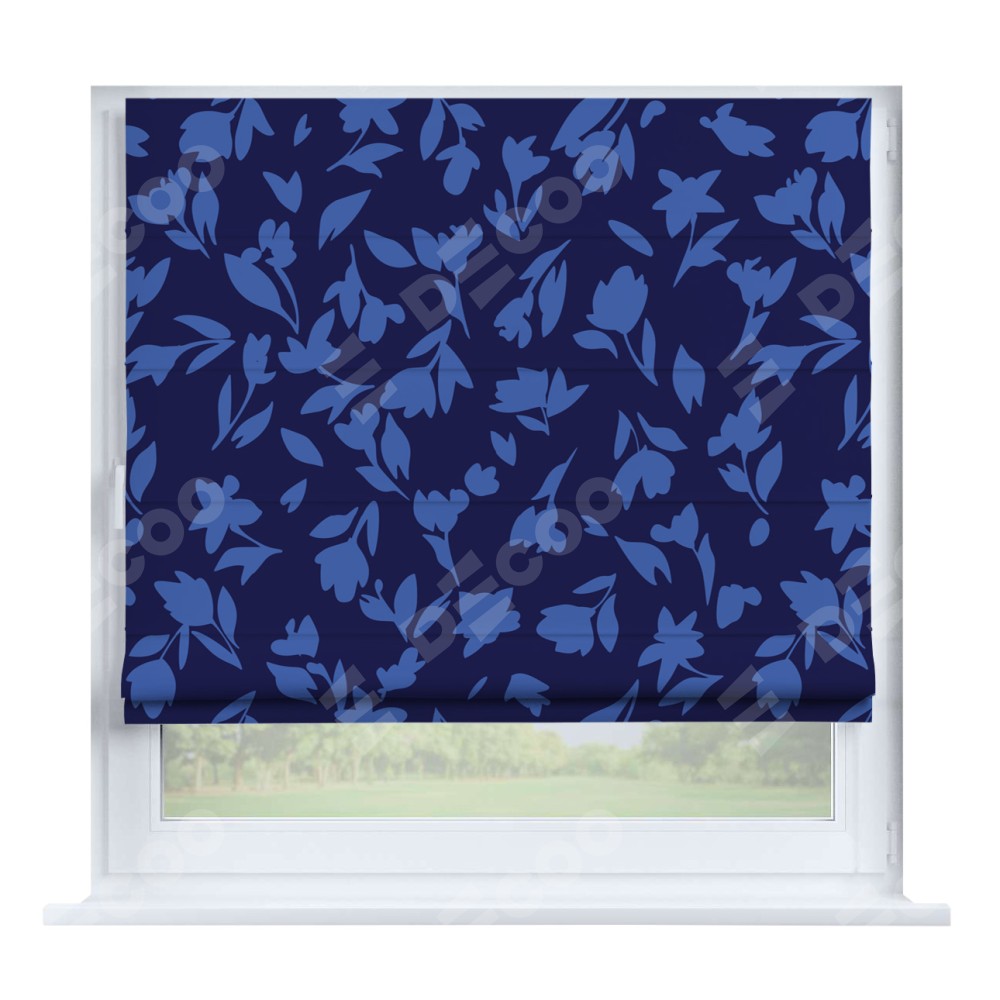Римская штора производителя «Cortin», устанавливается на створку окна, пошита из ткани блэкаут с нанесением сублимационной печати «Синие цветы». Штора шьётся по индивидуальным размерам, для данного типа римской шторы возможная ширина от 35 до 150 см., высота до 250 см.