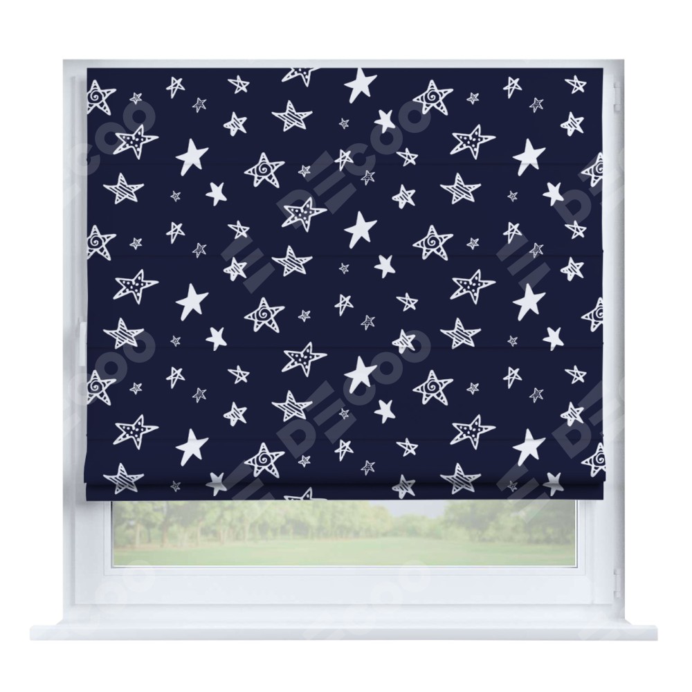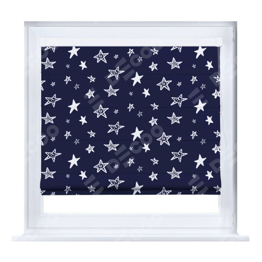 Римская штора производителя «Cortin», устанавливается на створку окна, пошита из ткани блэкаут с нанесением сублимационной печати «Ночные звёзды». Штора шьётся по индивидуальным размерам, для данного типа римской шторы возможная ширина от 35 до 150 см., высота до 250 см.