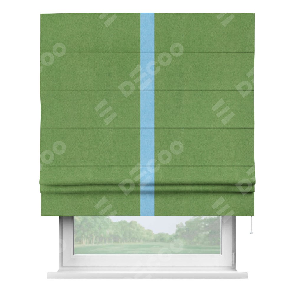 Римская штора производителя «Cortin», используется для проёма, пошита из ткани вельвет салатовый, артикул ткани 87072. Отделка шторы кантом «Хайвей», ткань для канта используется из вельвета разной расцветки на выбор. Имеет универсальный механизм и подходит для монтажа: на потолок, на стену и в нишу.