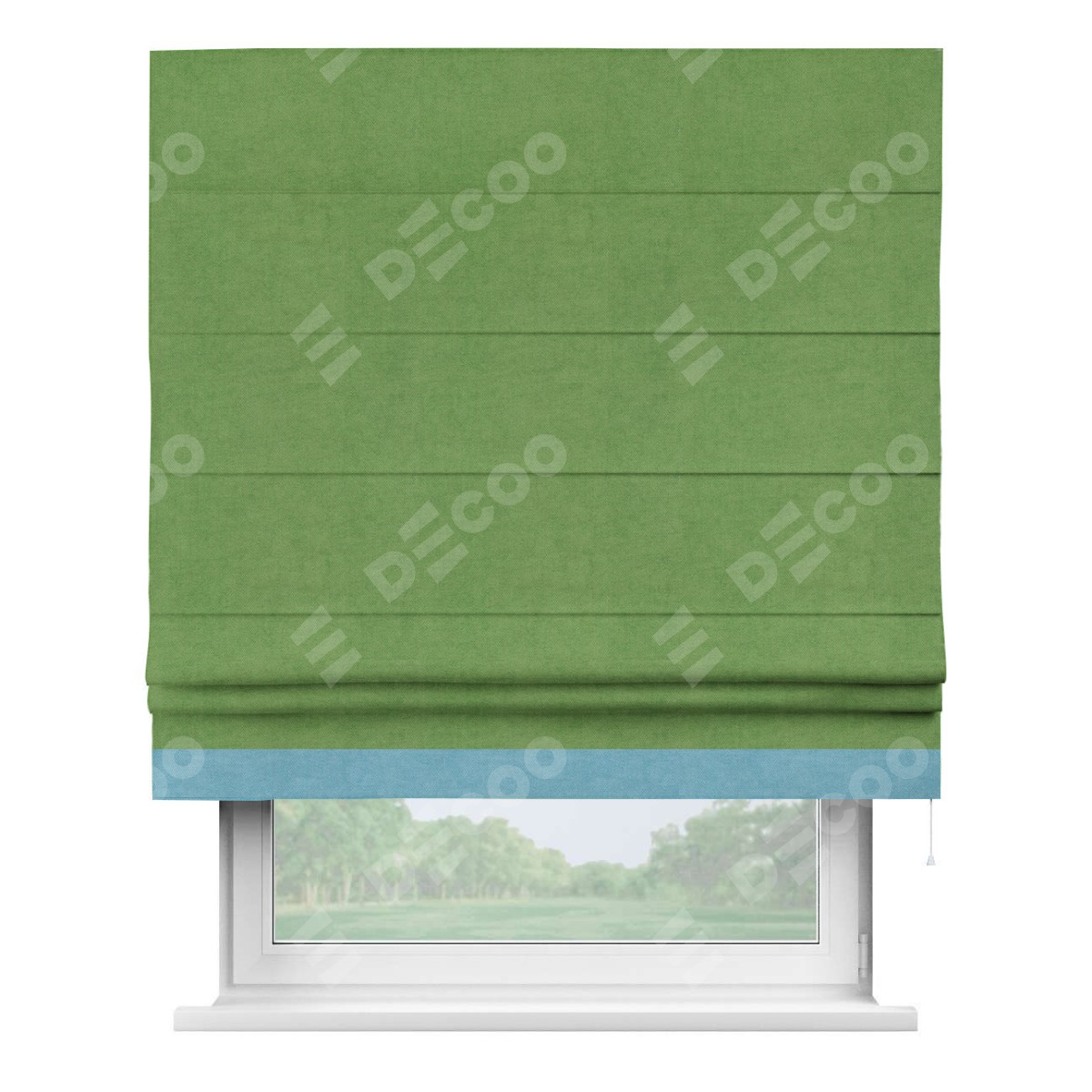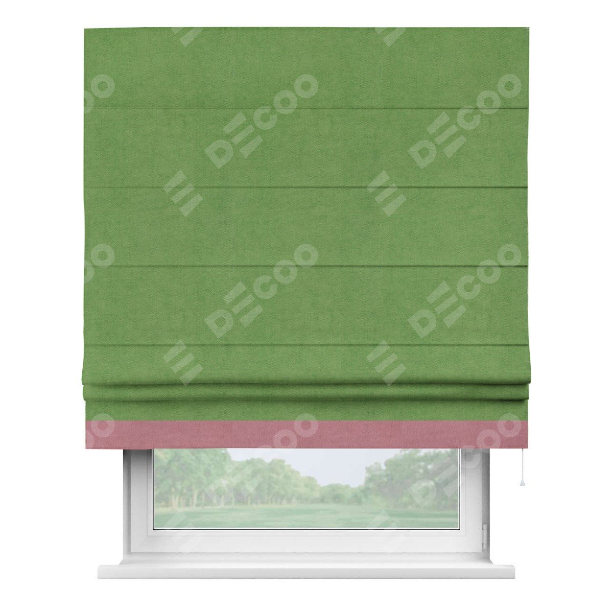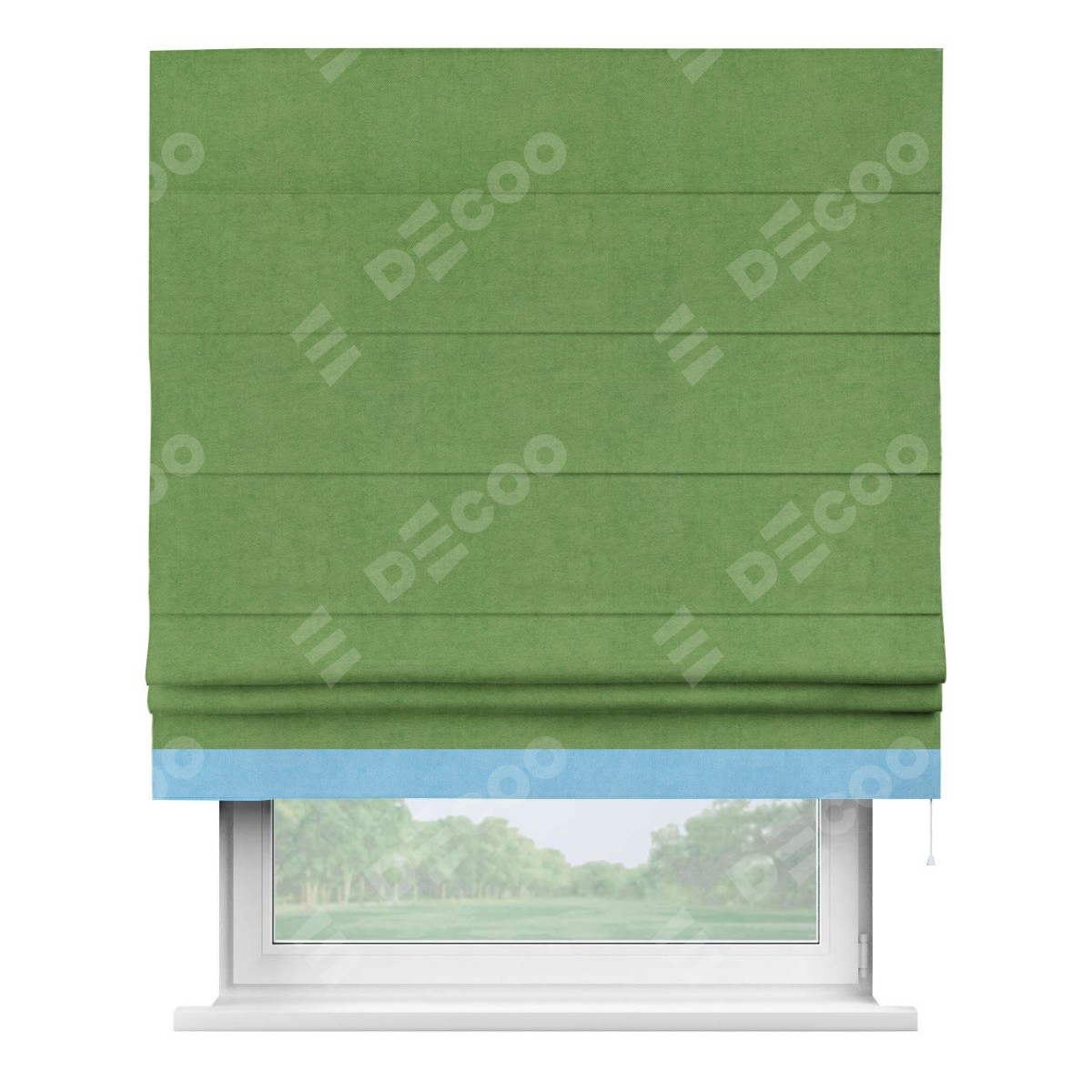 Римская штора производителя «Cortin», используется для проёма, пошита из ткани вельвет салатовый, артикул ткани 87072. Отделка шторы кантом «Джестер», ткань для канта используется из вельвета разной расцветки на выбор. Имеет универсальный механизм и подходит для монтажа: на потолок, на стену и в нишу.