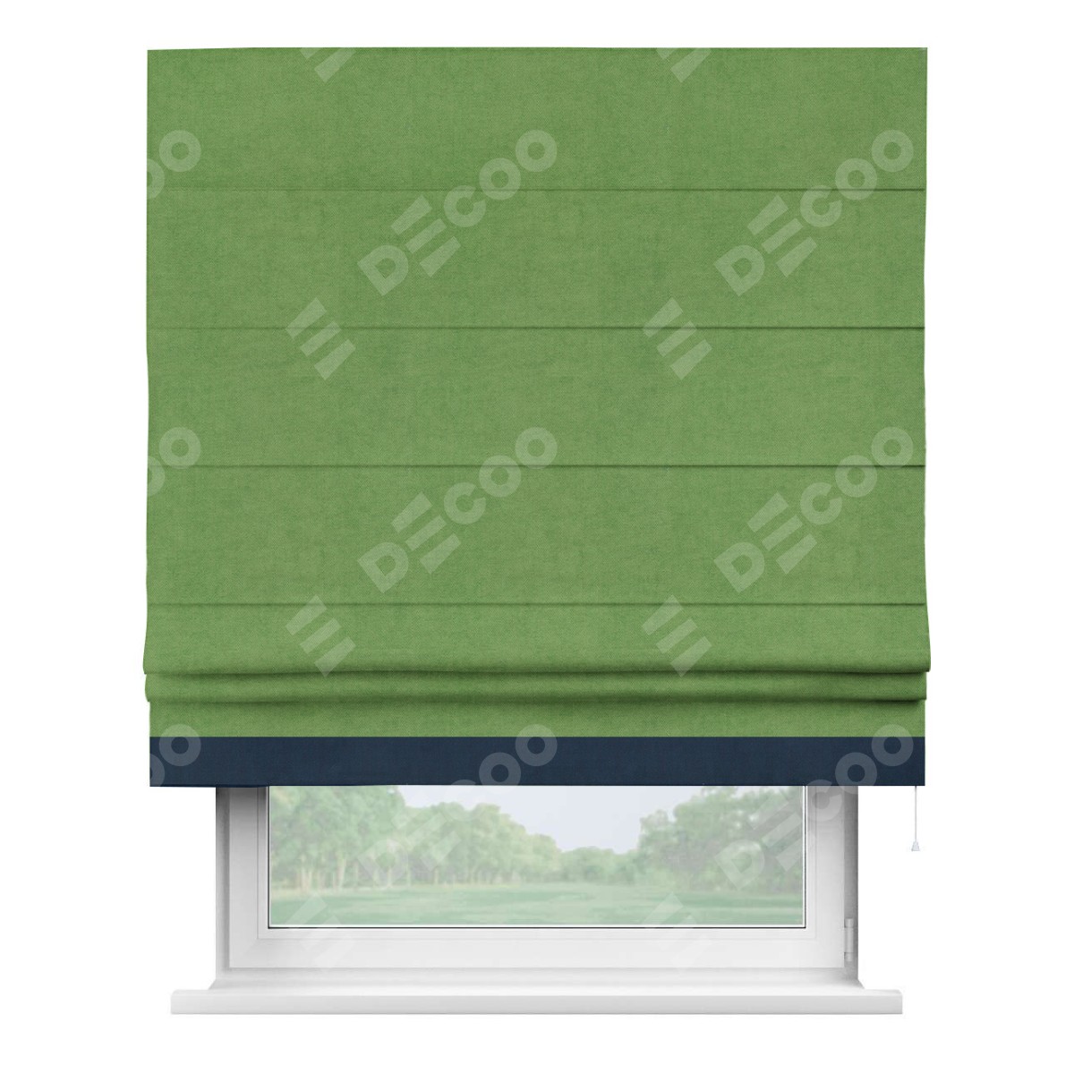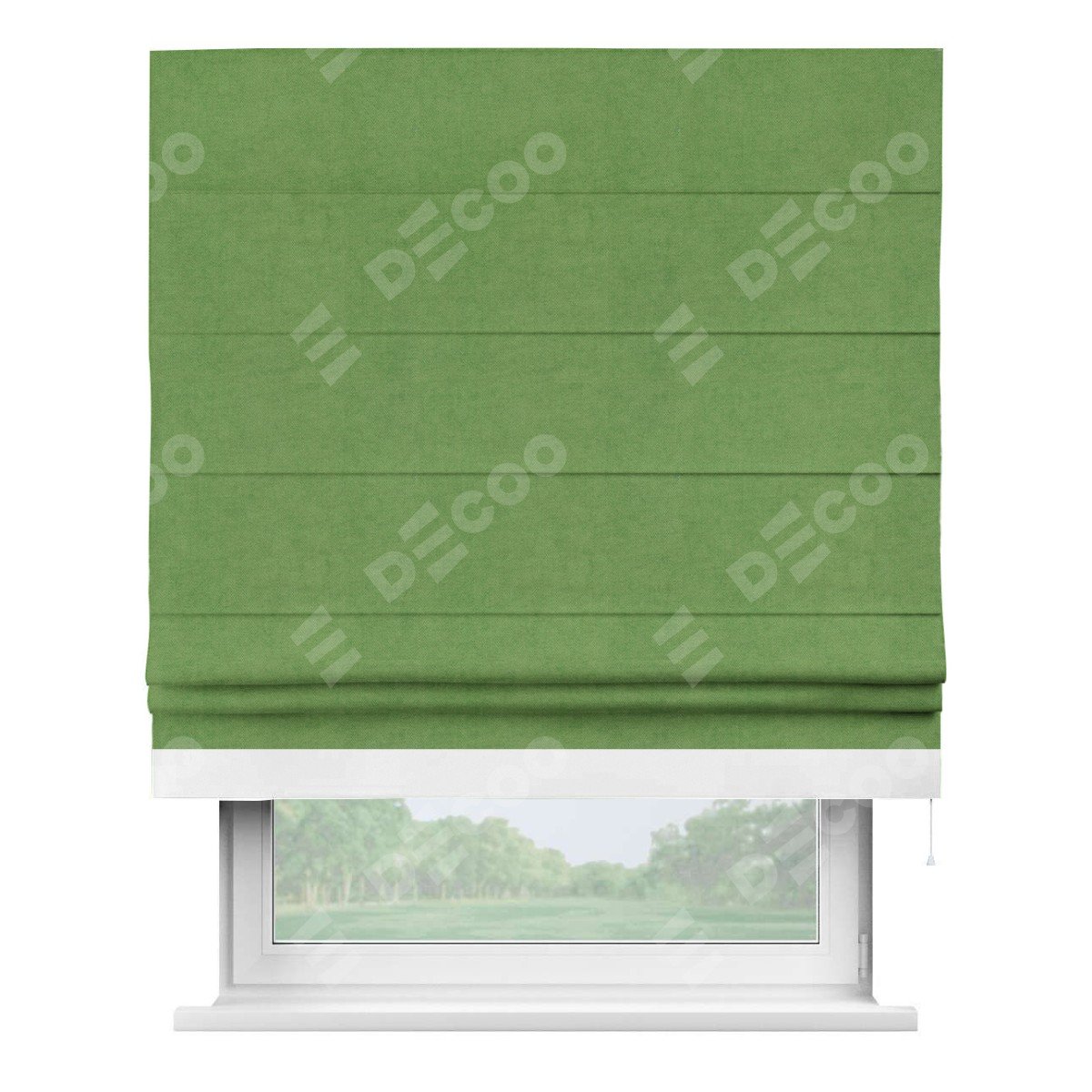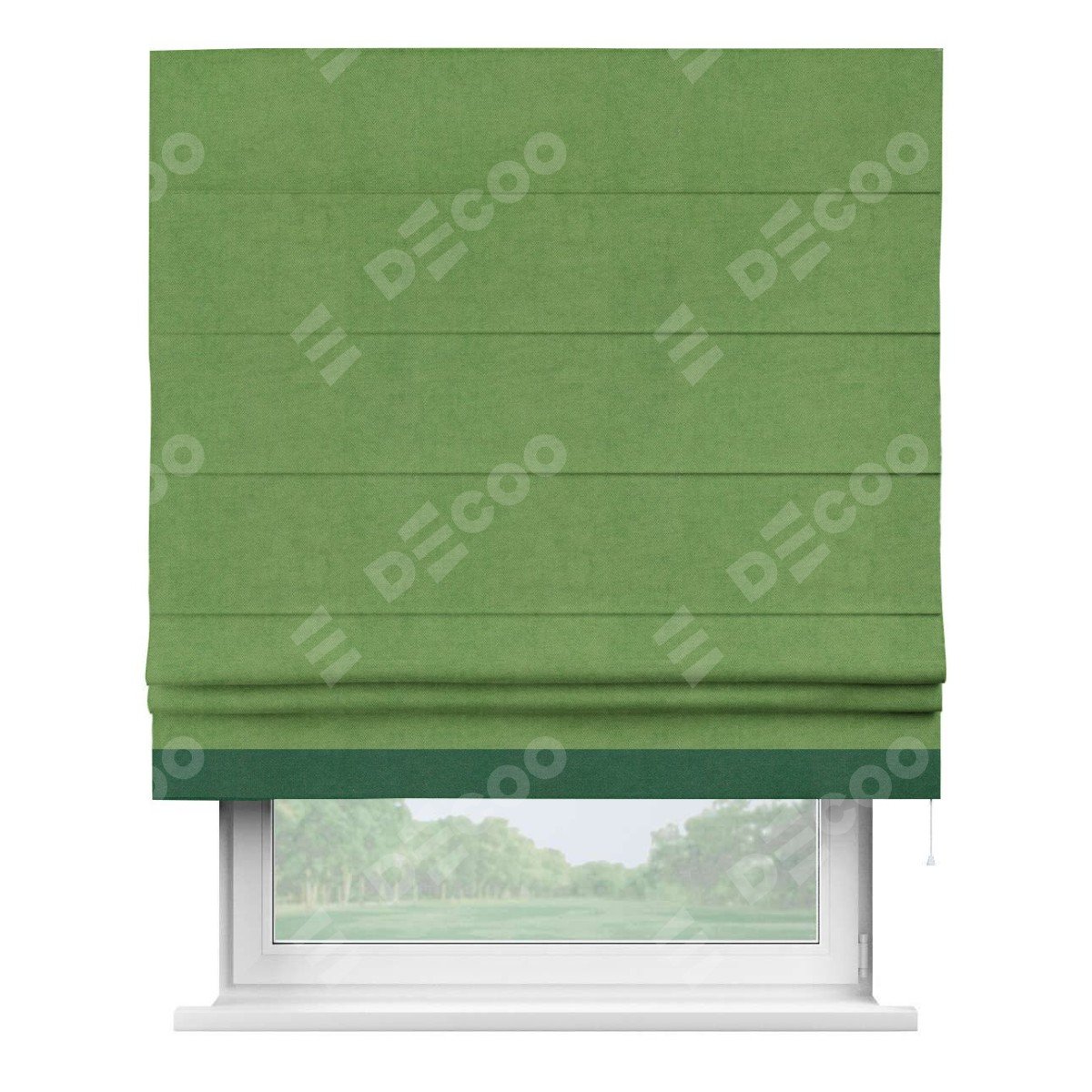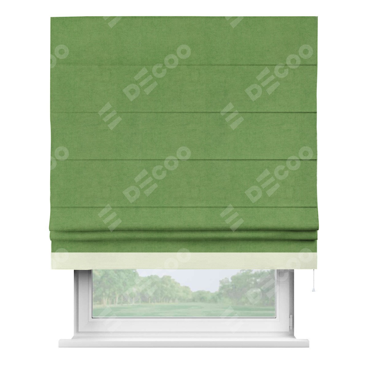 Римская штора производителя «Cortin», используется для проёма, пошита из ткани вельвет салатовый, артикул ткани 87072. Отделка шторы кантом «Джестер», ткань для канта используется из вельвета разной расцветки на выбор. Имеет универсальный механизм и подходит для монтажа: на потолок, на стену и в нишу.