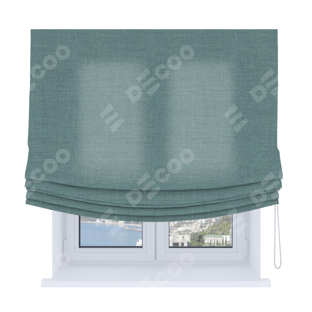 Римская штора Soft производителя «Cortin», используется для проёма, пошита из ткани лён голубой, артикул ткани 74736. Имеет универсальный механизм и подходит для монтажа: на потолок, на стену и в нишу. В отличие от стандартных римских штор, римская штора Soft не имеет горизонтальных вставок и нижнего отвеса. Это позволяет ткани произвольно драпироваться в свободные мягкие складки.
