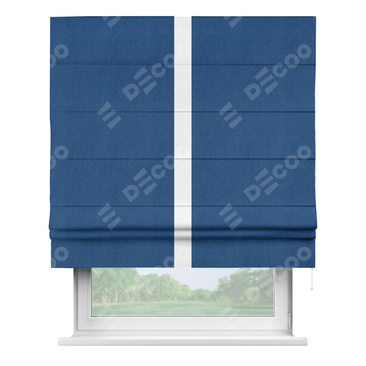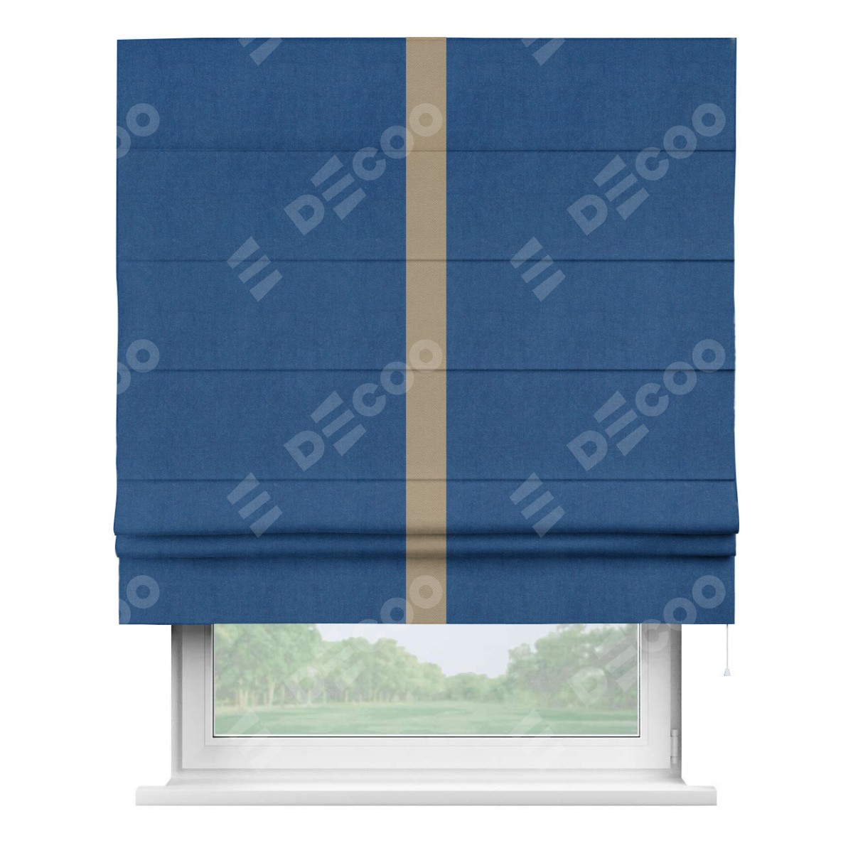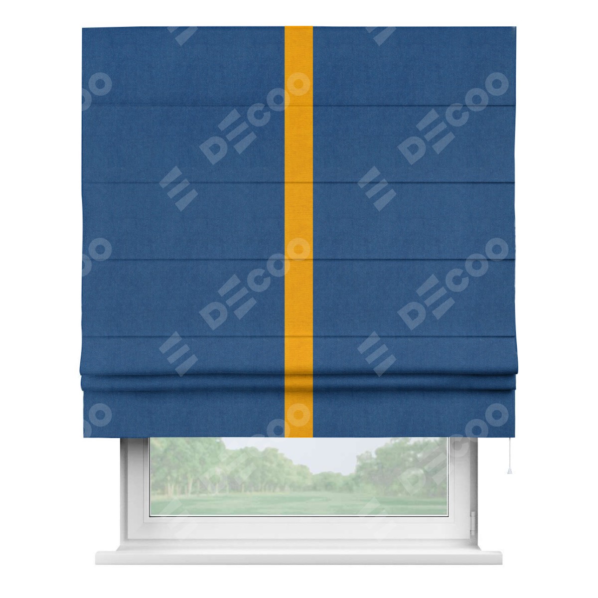 Римская штора производителя «Cortin», используется для проёма, пошита из ткани вельвет синий, артикул ткани 85554. Отделка шторы кантом «Хайвей», ткань для канта используется из вельвета разной расцветки на выбор. Имеет универсальный механизм и подходит для монтажа: на потолок, на стену и в нишу.
