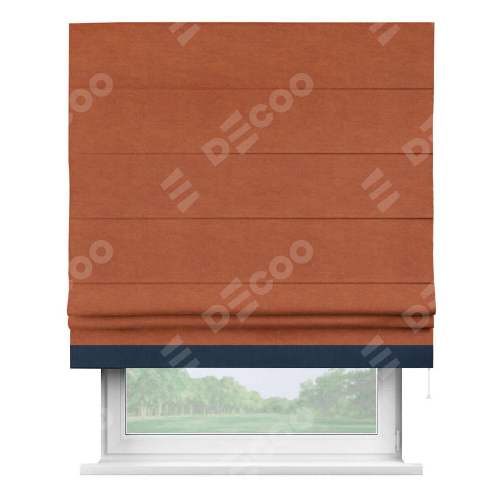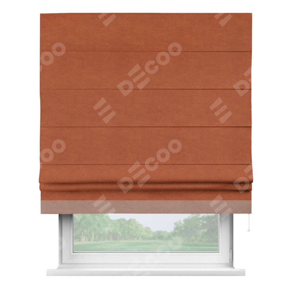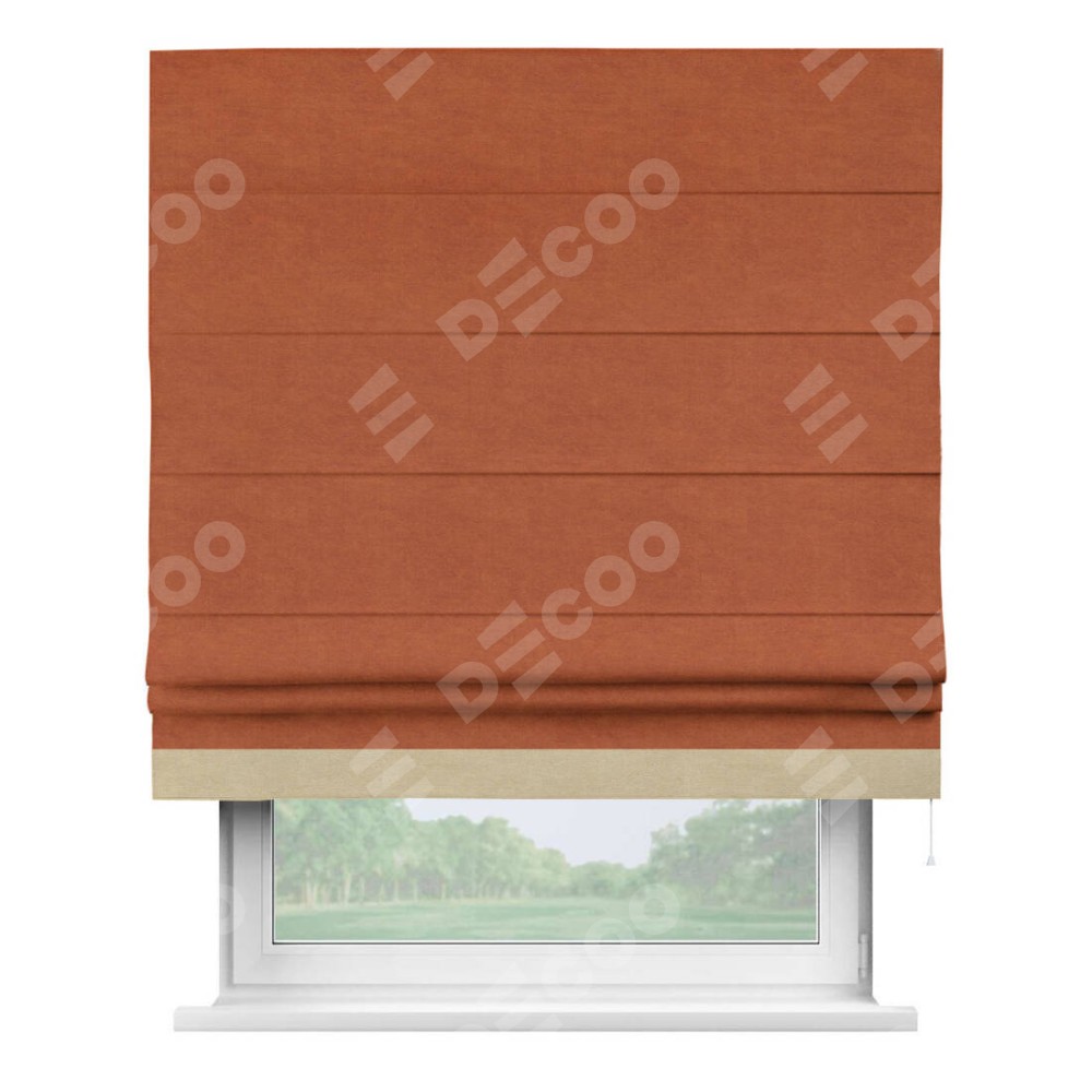 Римская штора производителя «Cortin», используется для проёма, пошита из ткани вельвет терракотовый, артикул ткани 85548. Отделка шторы кантом «Джестер», ткань для канта используется из вельвета разной расцветки на выбор. Имеет универсальный механизм и подходит для монтажа: на потолок, на стену и в нишу.