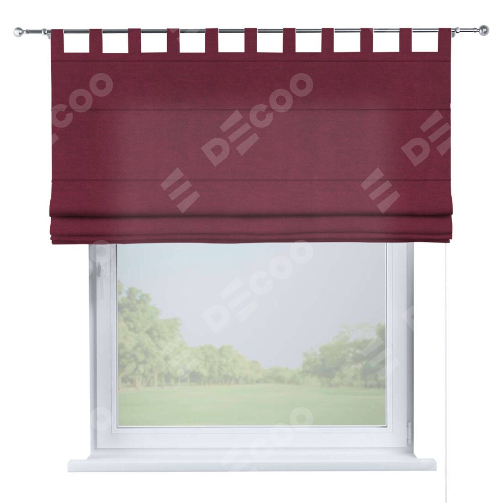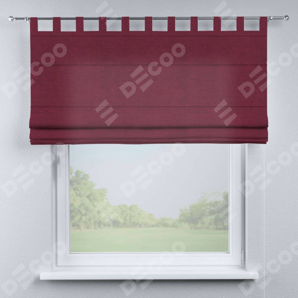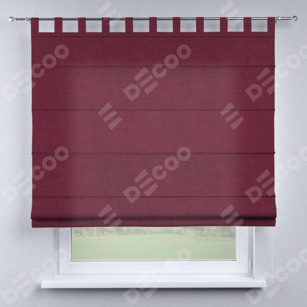 Римская штора производителя «Cortin», используется для проёма, пошита из ткани вельвет бордовый, артикул ткани 85553. Данная модель пошита на петлях, комплектуется на выбор круглым карнизом и подходит для монтажа на стену. Римская штора на петлях имеет простую систему регулировки высоты, отличительным преимуществом данной модели является простой способ монтажа. Достаточно повесить ее на трубу и штора готова!