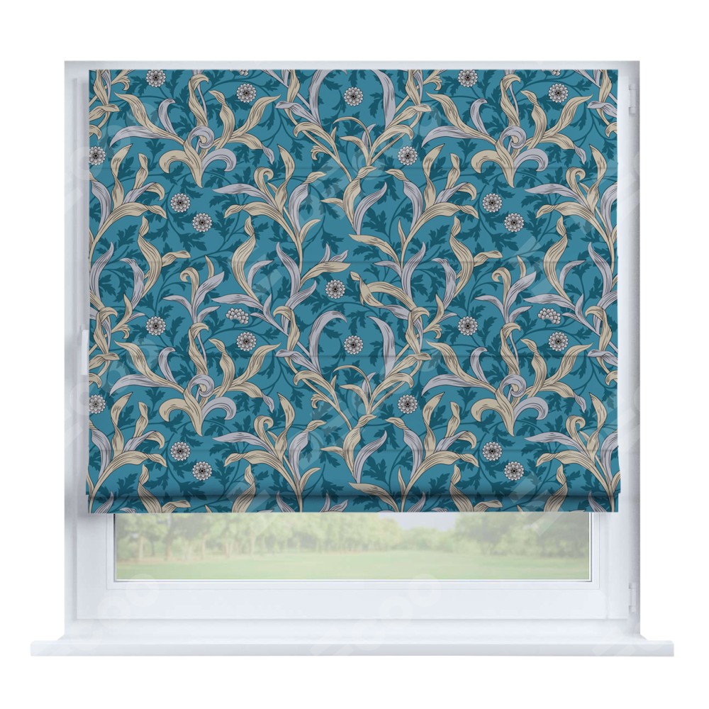 Римская штора производителя «Cortin», устанавливается на створку окна, пошита из ткани блэкаут с нанесением сублимационной печати «Винтажные листья». Штора шьётся по индивидуальным размерам, для данного типа римской шторы возможная ширина от 35 до 150 см., высота до 250 см.