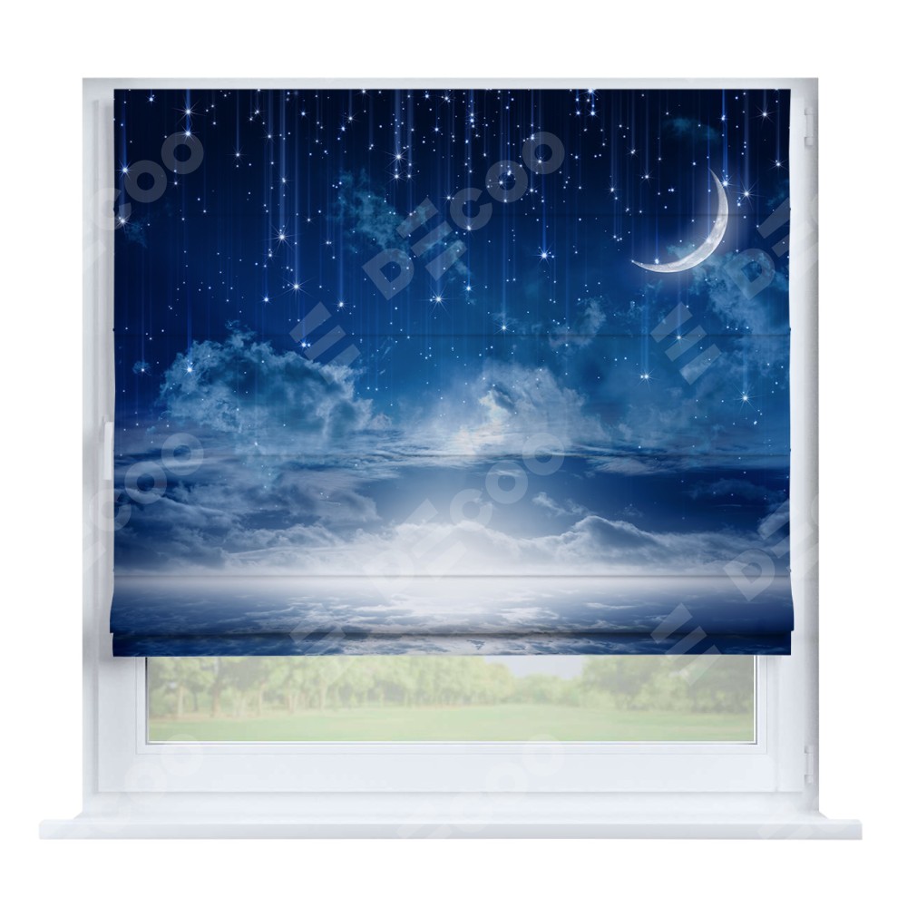 Римская штора производителя «Cortin», устанавливается на створку окна, пошита из ткани блэкаут с нанесением сублимационной печати «Ночное небо». Штора шьётся по индивидуальным размерам, для данного типа римской шторы возможная ширина от 35 до 150 см., высота до 250 см.