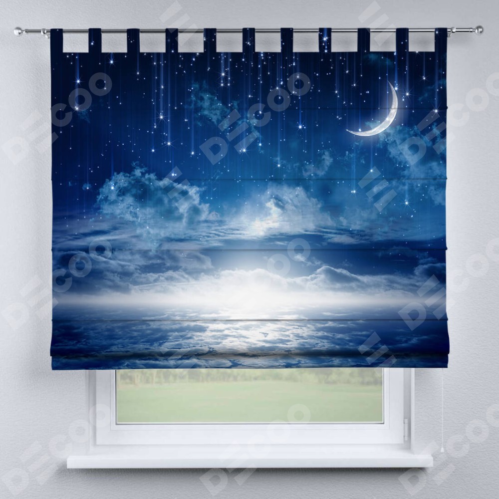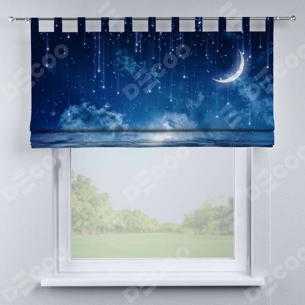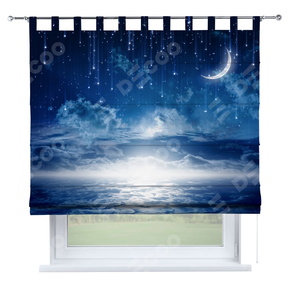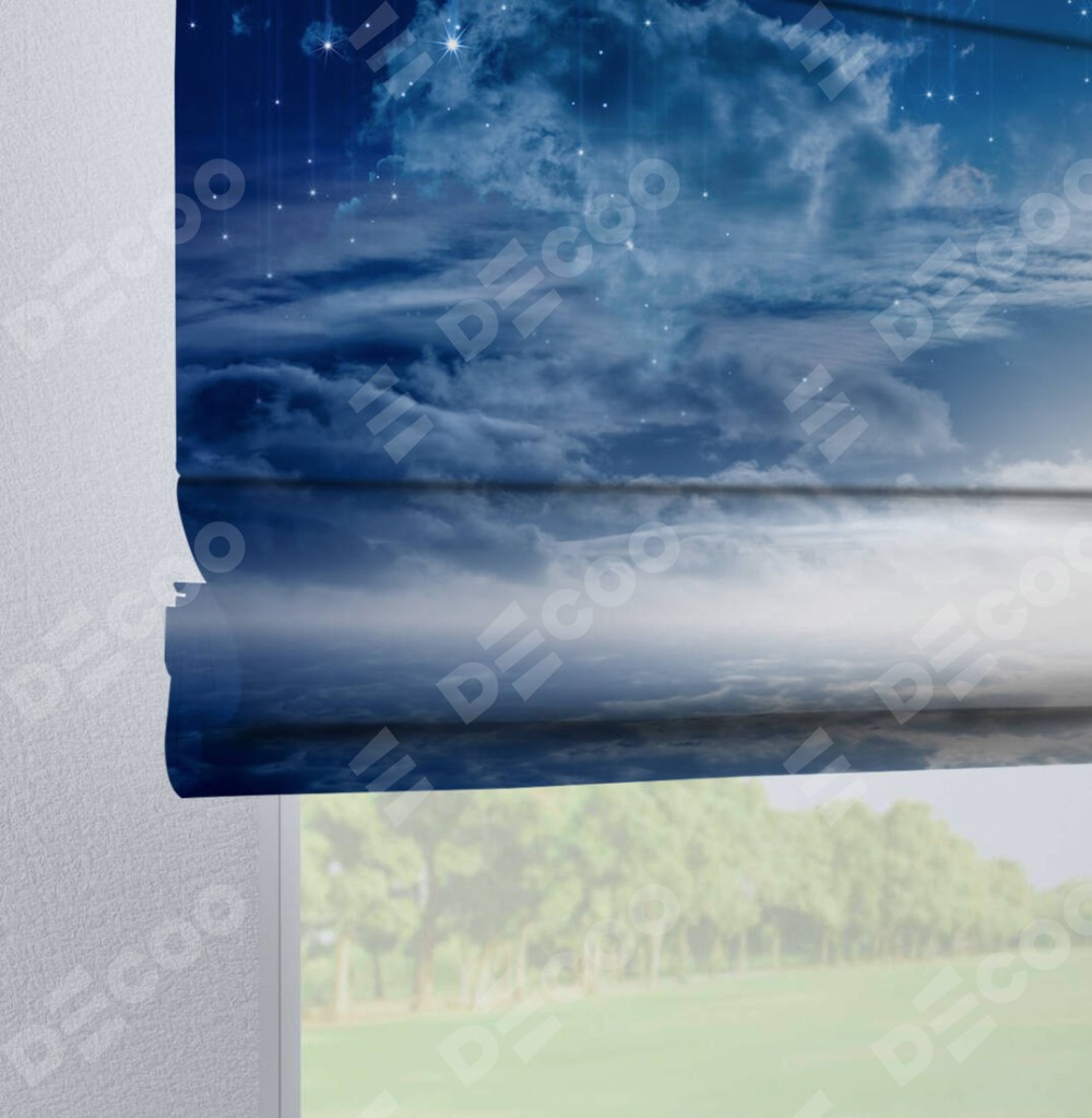 Римская штора производителя «Cortin», используется для проёма, пошита из ткани блэкаут с нанесением сублимационной печати «Ночное небо». Данная модель пошита на петлях, комплектуется на выбор круглым карнизом и подходит для монтажа на стену. Римская штора на петлях имеет простую систему регулировки высоты, отличительным преимуществом данной модели является простой способ монтажа. Достаточно повесить ее на трубу и штора готова!