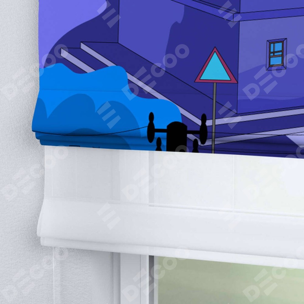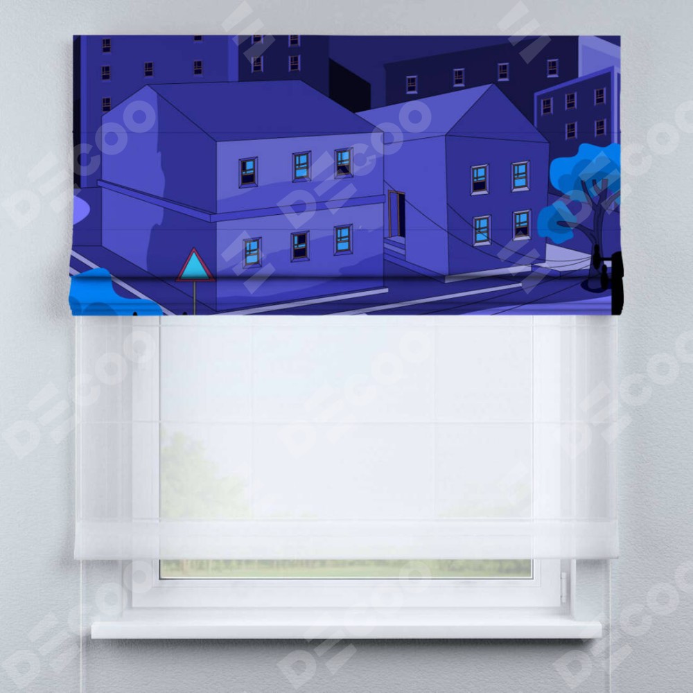 Римская штора день-ночь производителя «Cortin», используется для проёма, пошита из двух полотен, с лицевой блэкаут с нанесением сублимационной печати «Ночные улицы», вторая ткань тюль (по стандарту комплектуется тюль белого цвета артикул V-01). Имеет универсальный механизм и подходит для монтажа: на потолок, на стену и в нишу.