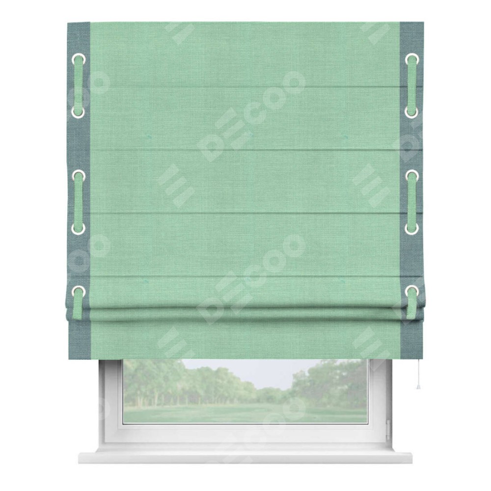 Римская штора производителя «Cortin», используется для проёма, пошита из ткани лён светло-бирюзовый, артикул 74737. Отделка шторы кантом «Стрим Дуо» на кантах расположены люверсы с пояском, ткань для канта используется из льна разной расцветки на выбор. Ткань для пояска обычно используется из основной ткани шторы, а так же можно сделать из любой расцветки по желанию. Имеет универсальный механизм и подходит для монтажа: на потолок, на стену и в нишу.