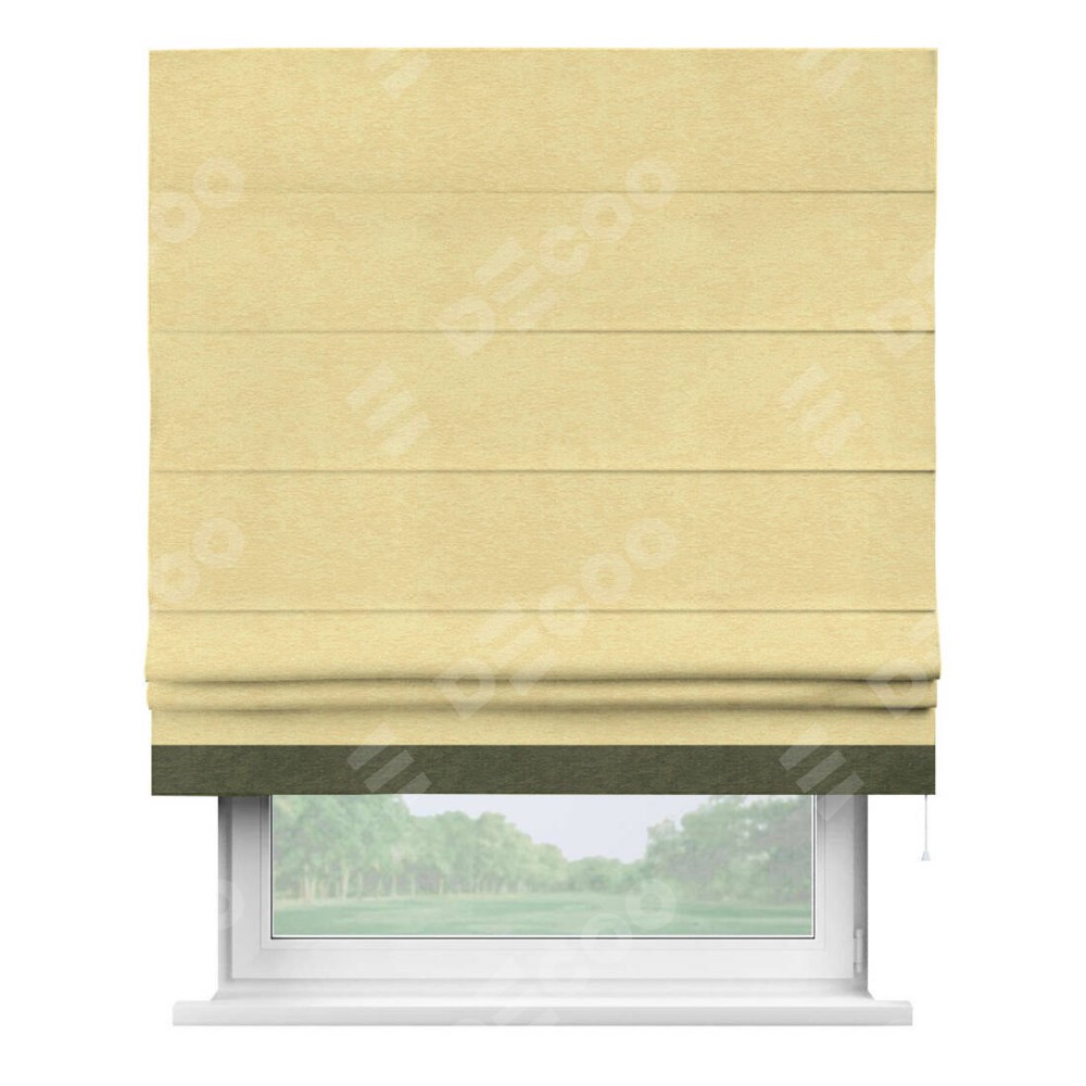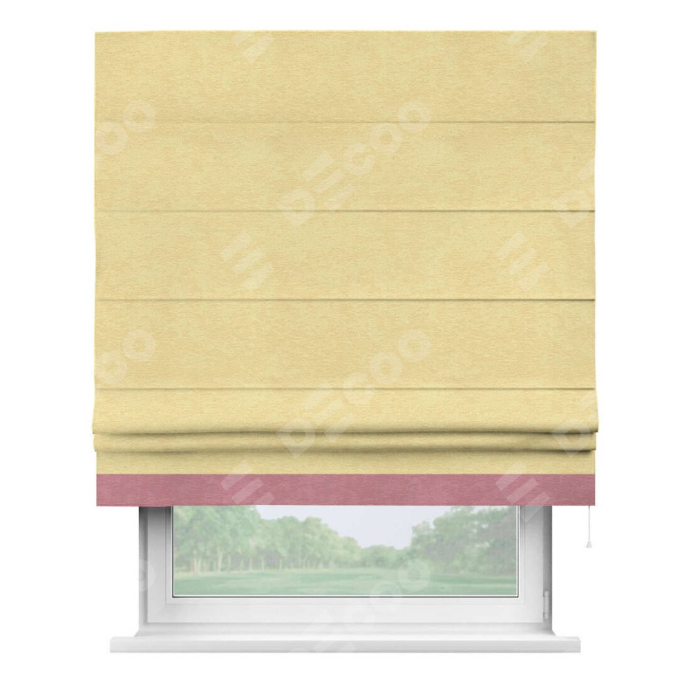 Римская штора производителя «Cortin», используется для проёма, пошита из ткани софт однотонный золотой, артикул 42934. Отделка шторы кантом «Джестер», ткань для канта используется из софта разной расцветки на выбор. Имеет универсальный механизм и подходит для монтажа: на потолок, на стену и в нишу.