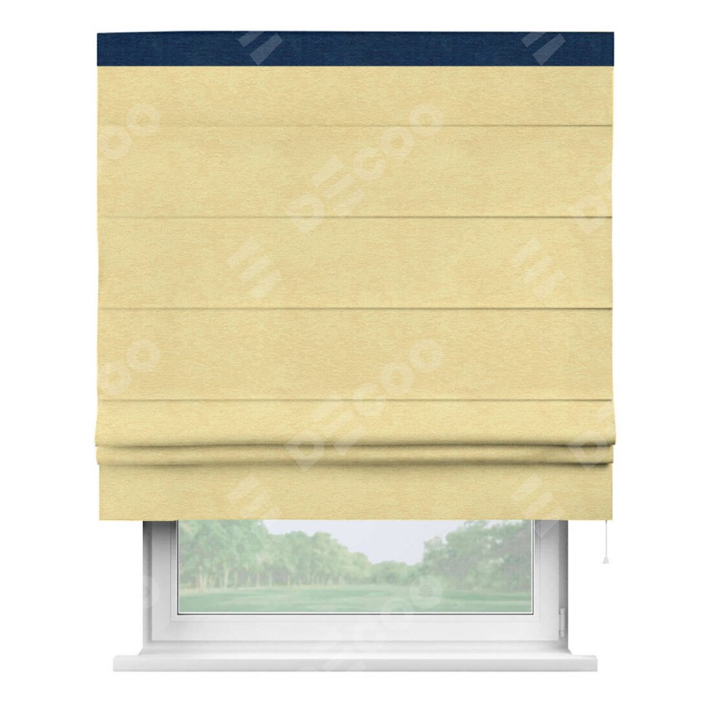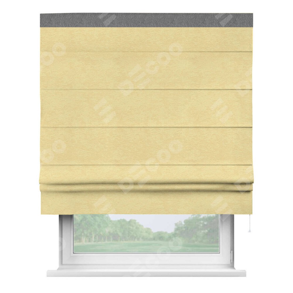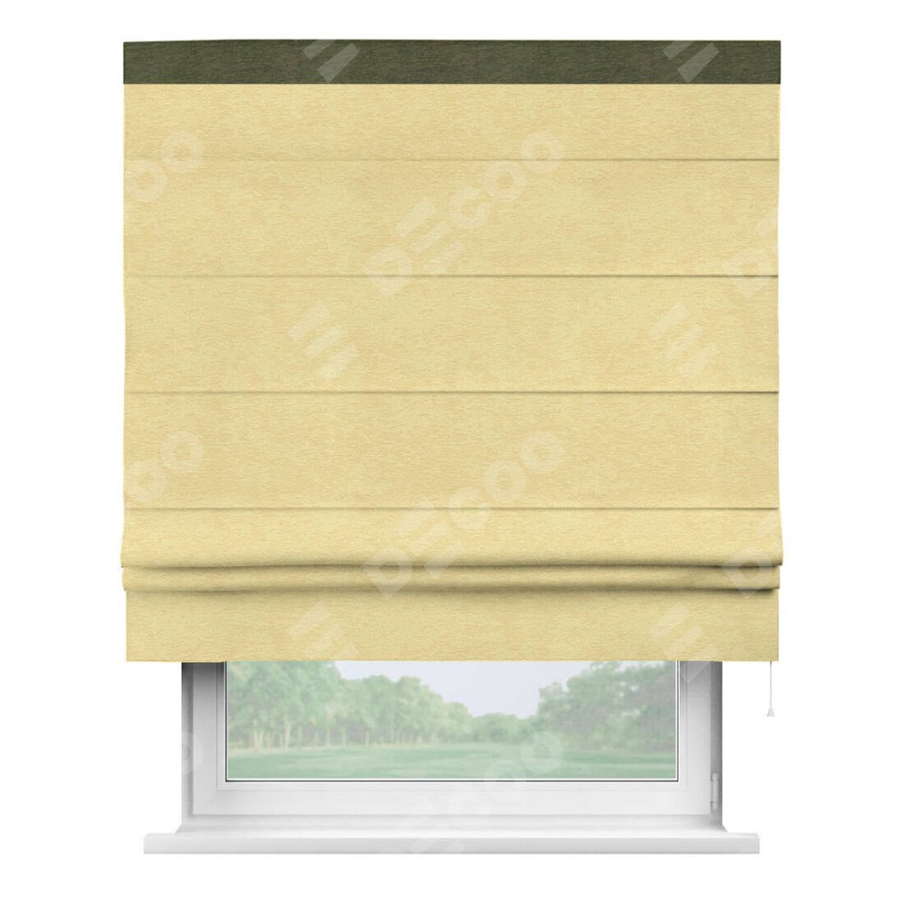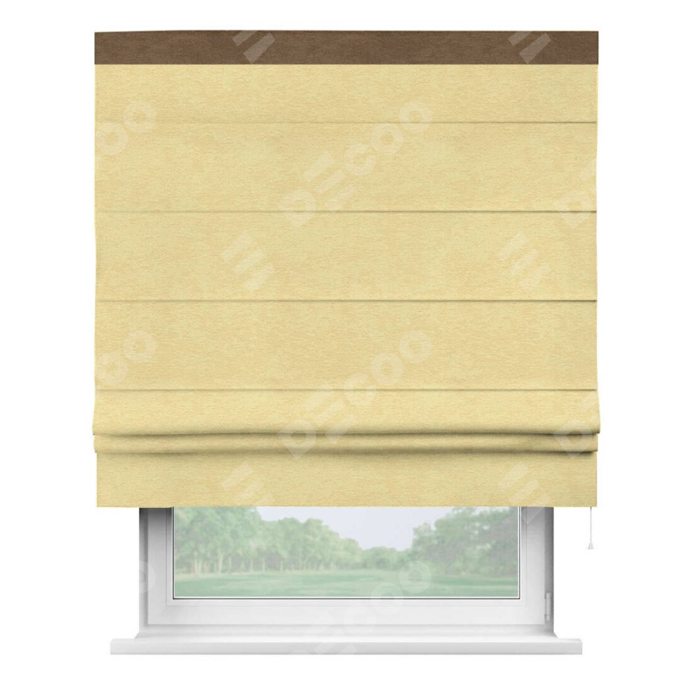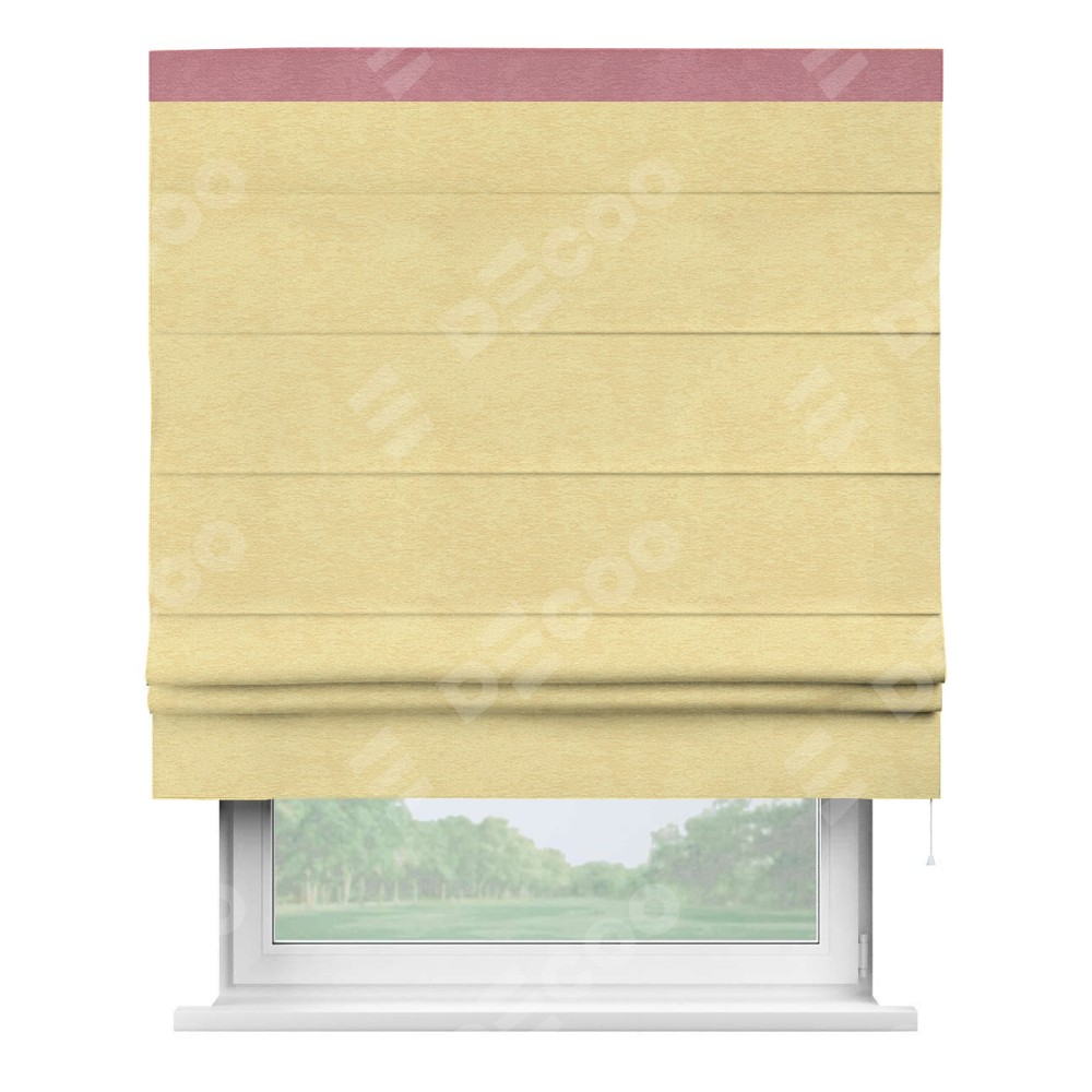 Римская штора производителя «Cortin», используется для проёма, пошита из ткани софт однотонный золотой, артикул 42934. Отделка шторы кантом «Кинг», ткань для канта используется из софта разной расцветки на выбор. Имеет универсальный механизм и подходит для монтажа: на потолок, на стену и в нишу.