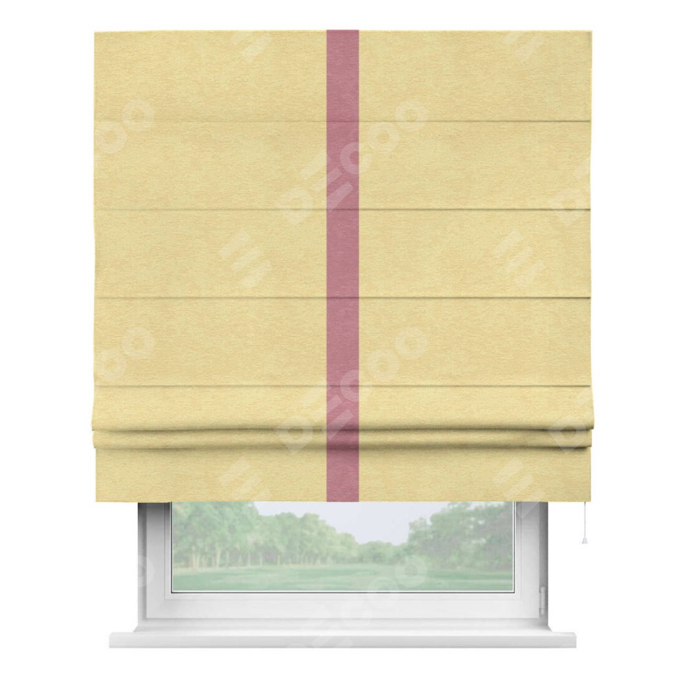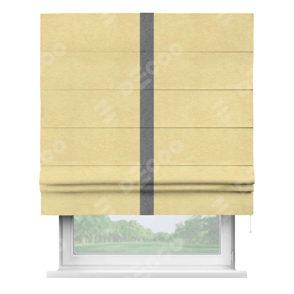 Римская штора производителя «Cortin», используется для проёма, пошита из ткани софт однотонный золотой, артикул 42934. Отделка шторы кантом «Хайвэй», ткань для канта используется из софта разной расцветки на выбор. Имеет универсальный механизм и подходит для монтажа: на потолок, на стену и в нишу.