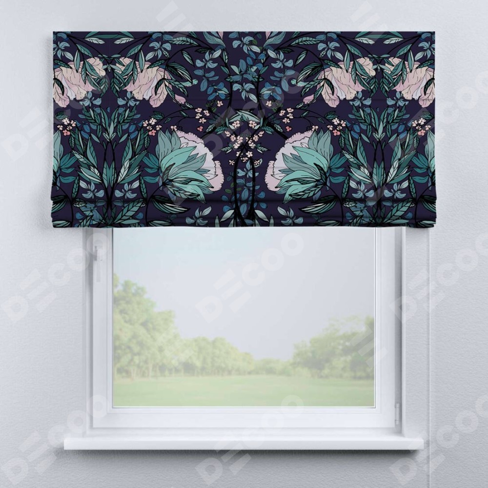 Римская штора производителя «Cortin», используется для проёма, пошита из ткани блэкаут с нанесением сублимационной печати «Цветочный индиго». Имеет универсальный механизм и подходит для монтажа: на потолок, на стену и в нишу.