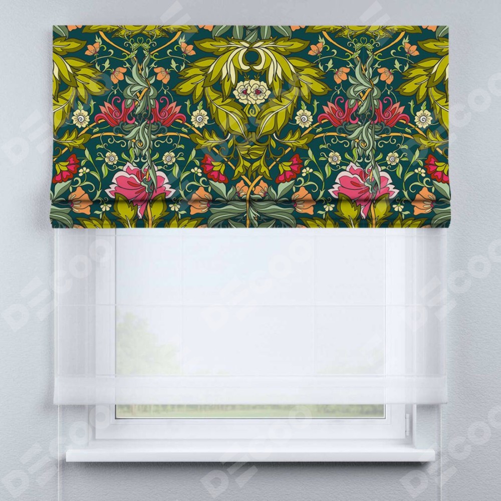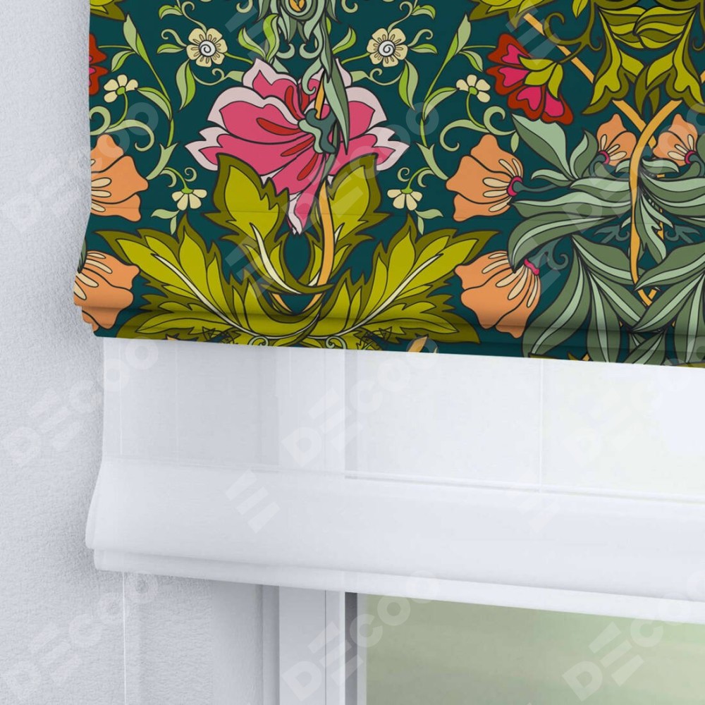 Римская штора день-ночь производителя «Cortin», используется для проёма, пошита из двух полотен, с лицевой блэкаут с нанесением сублимационной печати «Цветок морриса», вторая ткань тюль (по стандарту комплектуется тюль белого цвета артикул V-01). Имеет универсальный механизм и подходит для монтажа: на потолок, на стену и в нишу.