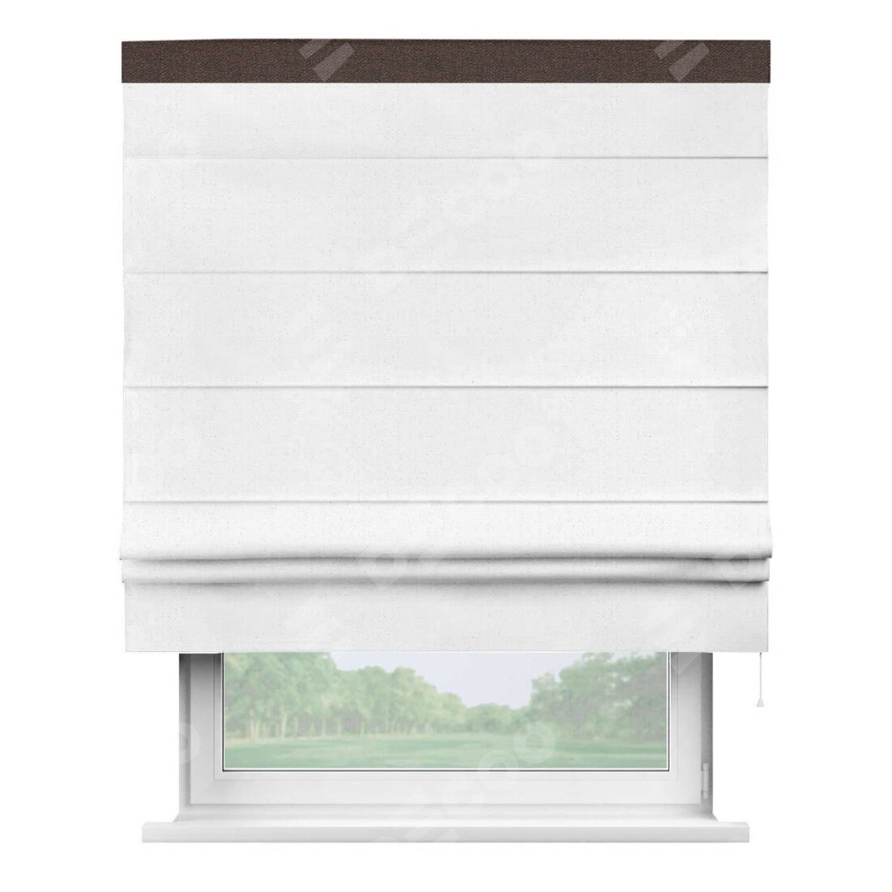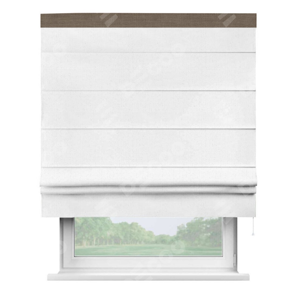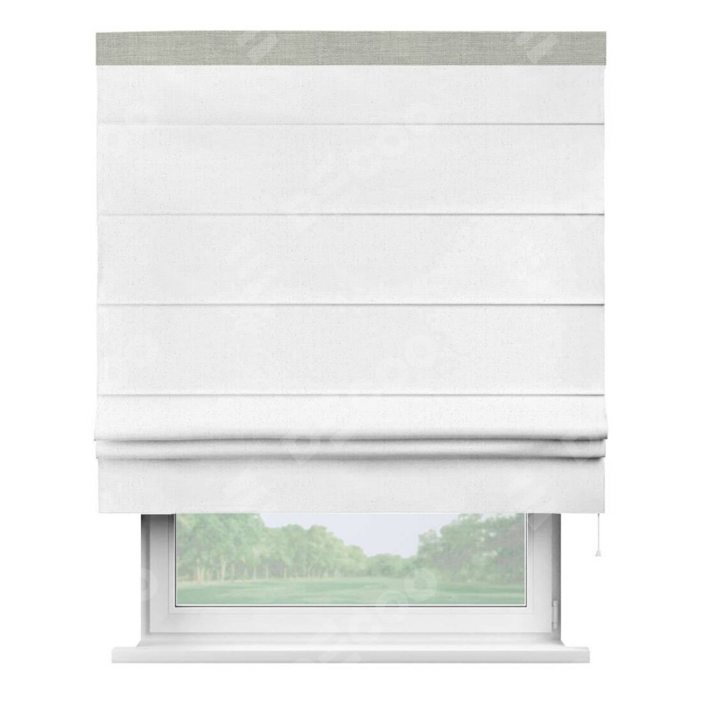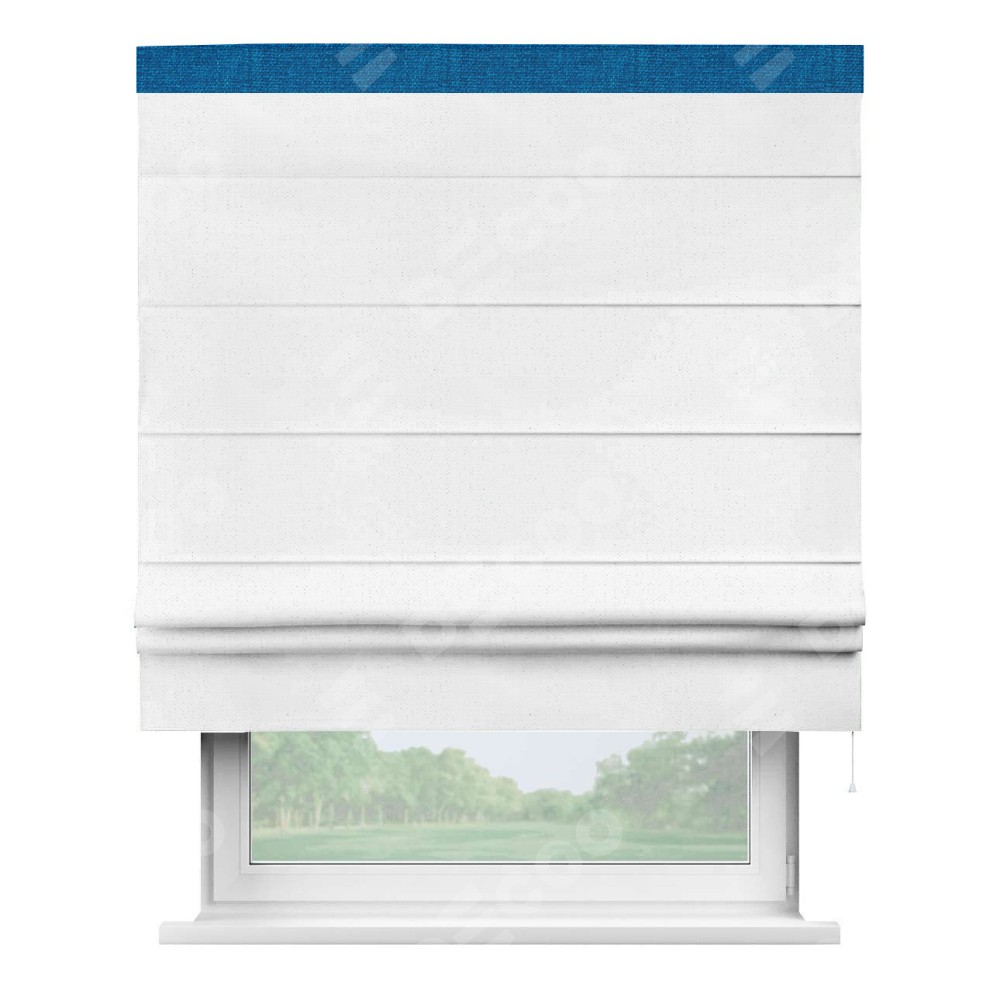 Римская штора производителя «Cortin», используется для проёма, пошита из ткани лён белый, артикул 7439. Отделка шторы кантом «Кинг», ткань для канта используется из льна разной расцветки на выбор. Имеет универсальный механизм и подходит для монтажа: на потолок, на стену и в нишу.