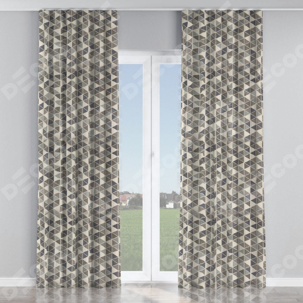 Комплект прямых штор, от производителя «Cortin», пошиты из ткани димаут «Треугольники синие», артикул ткани 23022. С изнаночной стороны в верхней части штор пристрачивается шторная лента с декоративными складками «Волна». Для создания элегантных складок прямые шторы шьются по стандарту с коэффициентом 1:2 (на 100 см. ширины проёма 200 см. ширины ткани).