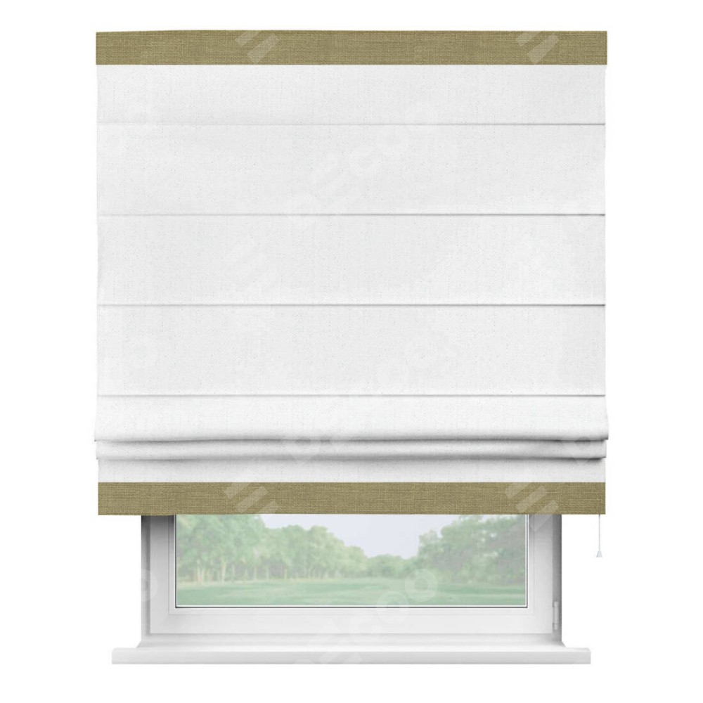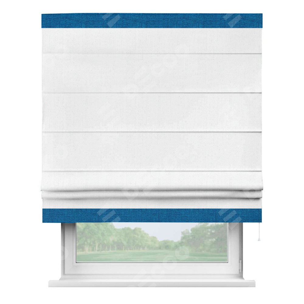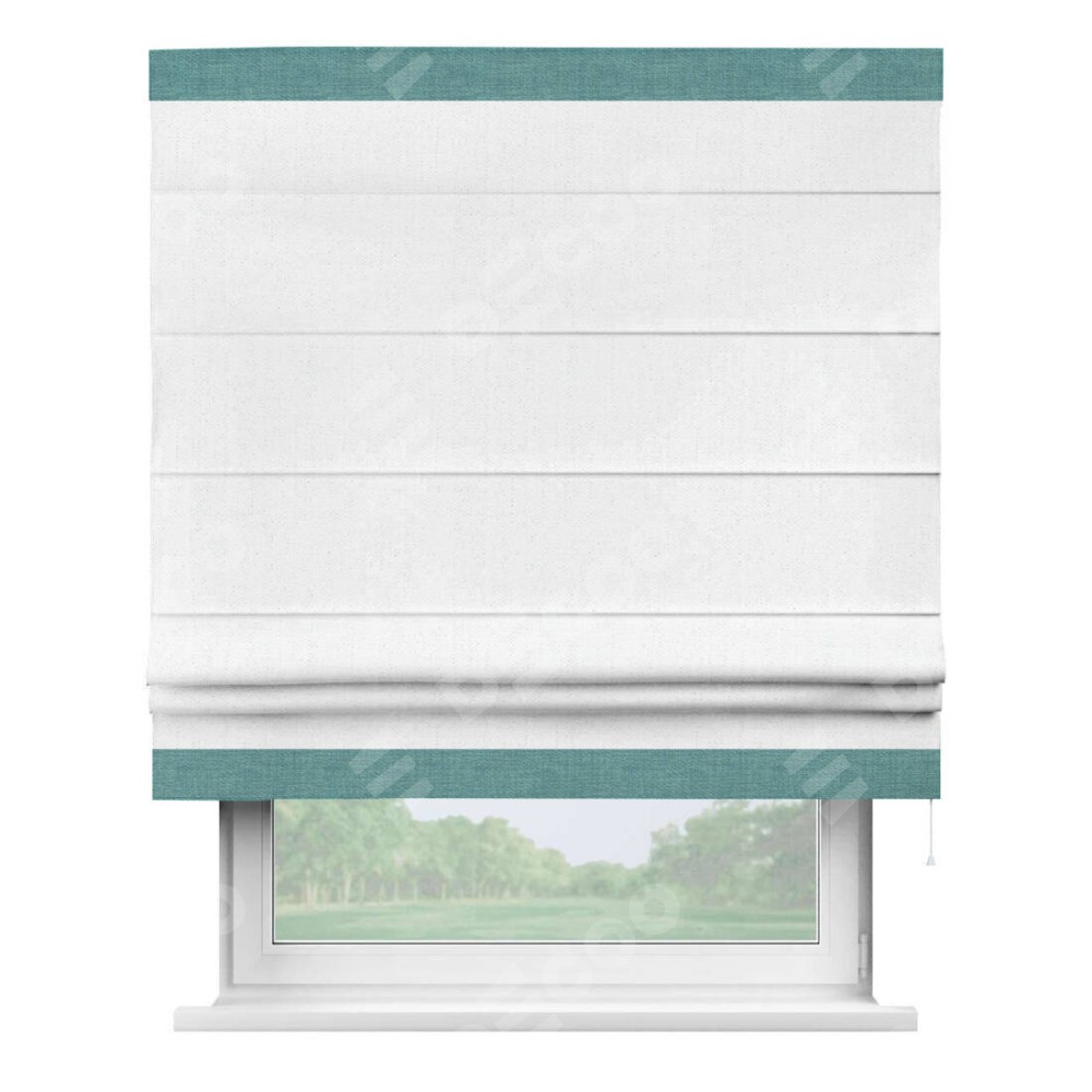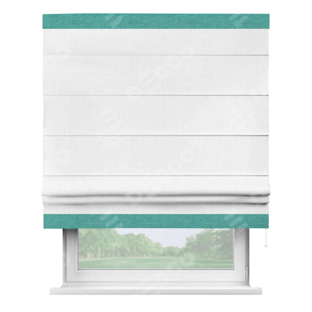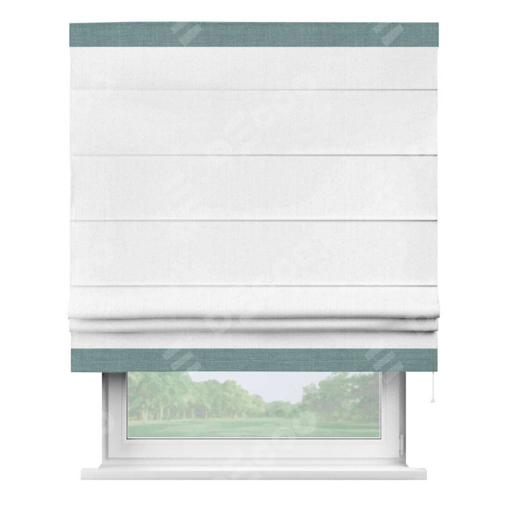 Римская штора производителя «Cortin», используется для проёма, пошита из ткани лён белоснежный, артикул 7438. Отделка шторы кантом «Горизонт», ткань для канта используется из льна разной расцветки на выбор. Имеет универсальный механизм и подходит для монтажа: на потолок, на стену и в нишу.