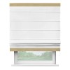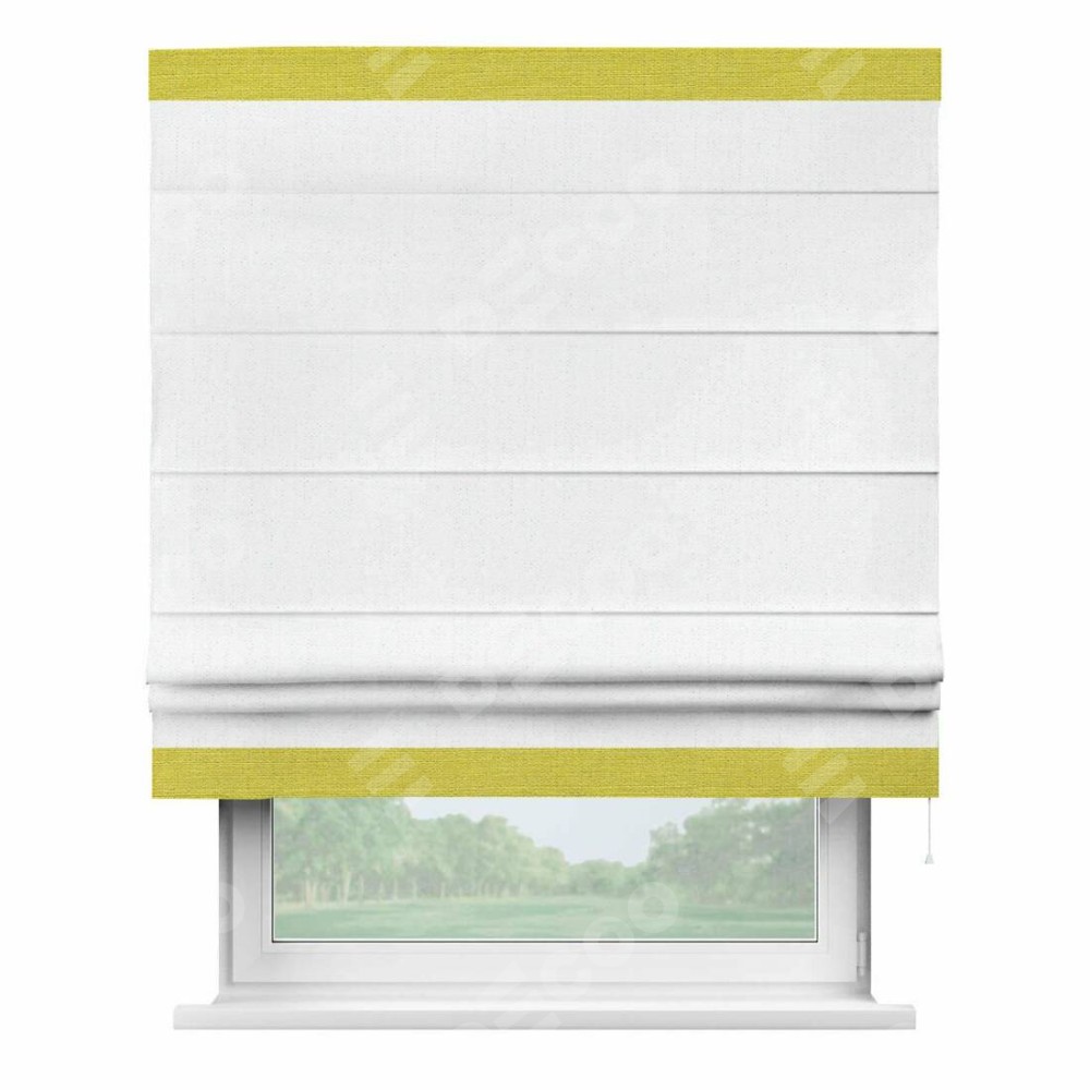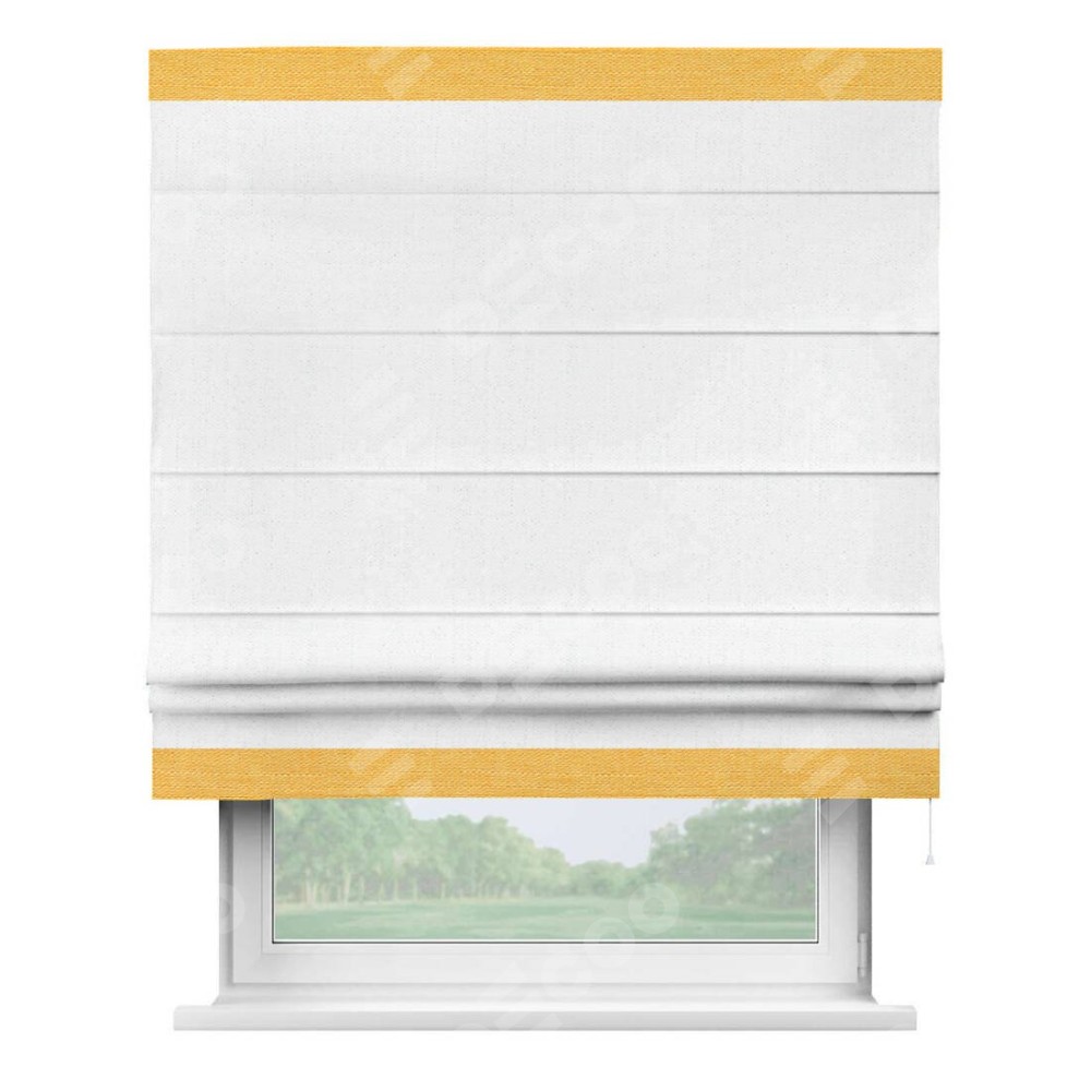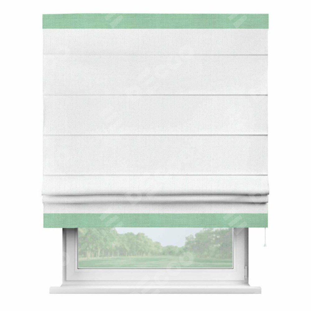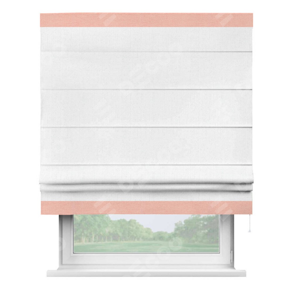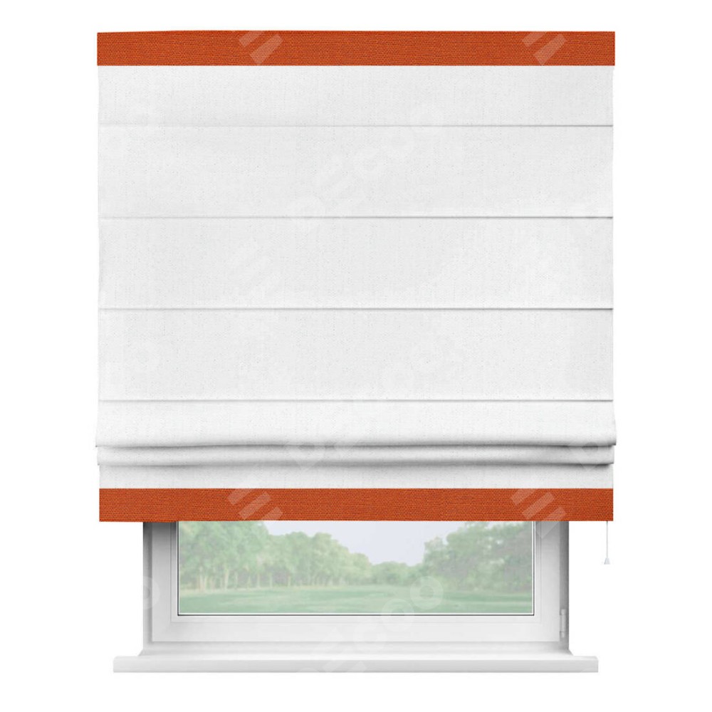 Римская штора производителя «Cortin», используется для проёма, пошита из ткани лён белоснежный, артикул 7438. Отделка шторы кантом «Горизонт», ткань для канта используется из льна разной расцветки на выбор. Имеет универсальный механизм и подходит для монтажа: на потолок, на стену и в нишу.
