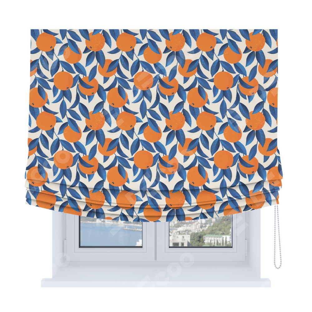 Римская штора Soft производителя «Cortin», используется для проёма, пошита из ткани блэкаут с нанесением сублимационной печати «Апельсиновое настроение». Имеет универсальный механизм и подходит для монтажа: на потолок, на стену и в нишу. В отличие от стандартных римских штор, римская штора Soft не имеет горизонтальных вставок и нижнего отвеса. Это позволяет ткани произвольно драпироваться в свободные мягкие складки.