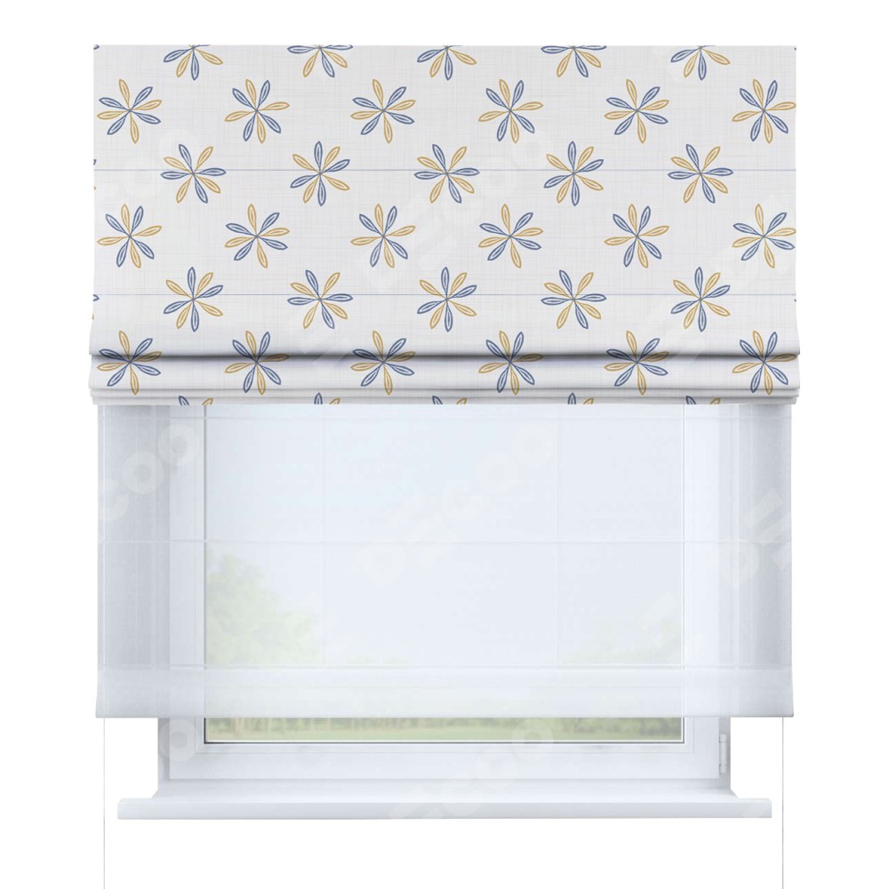Римская штора день-ночь производителя «Cortin», используется для проёма, пошита из двух полотен, с лицевой блэкаут с нанесением сублимационной печати «Ромашки кантри», вторая ткань тюль (по стандарту комплектуется тюль белого цвета артикул V-01). Имеет универсальный механизм и подходит для монтажа: на потолок, на стену и в нишу.