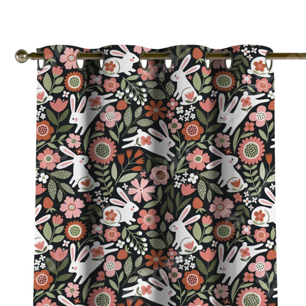 Комплект прямых штор, от производителя «Cortin», пошиты из ткани блэкаут с нанесением сублимационной печати «Зайчики в цветнике». Данная модель пошита на люверсах, комплектуется на выбор круглым карнизом и подходит для монтажа на стену или потолок. Прямые шторы на люверсах шьются по стандарту с коэффициентом 1/2 (на 100 см. ширины проёма 200 см. ширины ткани), отличительным преимуществом данной модели является простой способ монтажа. Достаточно повесить ее на трубу и штора готова!