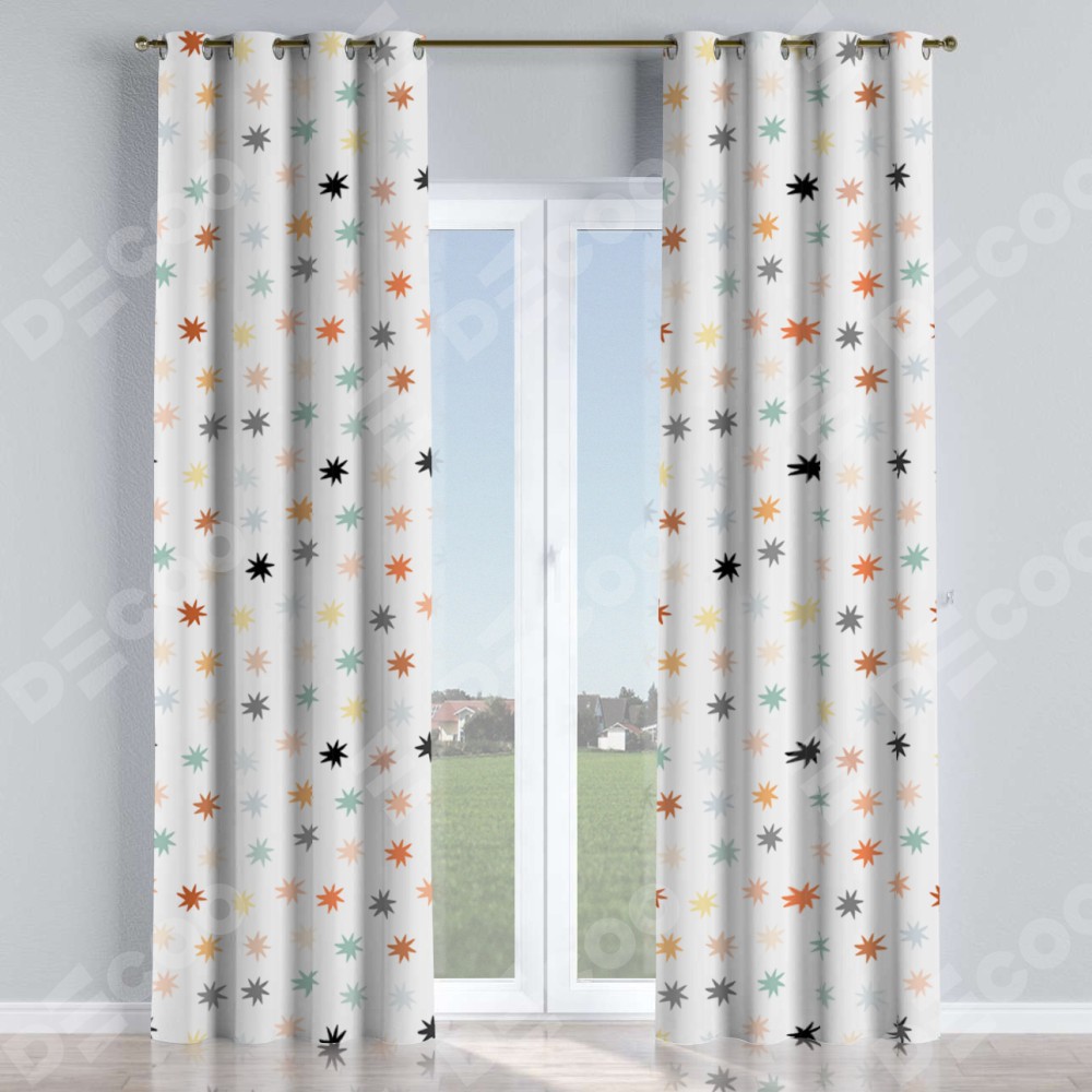 Комплект прямых штор, от производителя «Cortin», пошиты из ткани блэкаут с нанесением сублимационной печати «Разноцветные звёзды». Данная модель пошита на люверсах, комплектуется на выбор круглым карнизом и подходит для монтажа на стену или потолок. Прямые шторы на люверсах шьются по стандарту с коэффициентом 1/2 (на 100 см. ширины проёма 200 см. ширины ткани), отличительным преимуществом данной модели является простой способ монтажа. Достаточно повесить ее на трубу и штора готова!