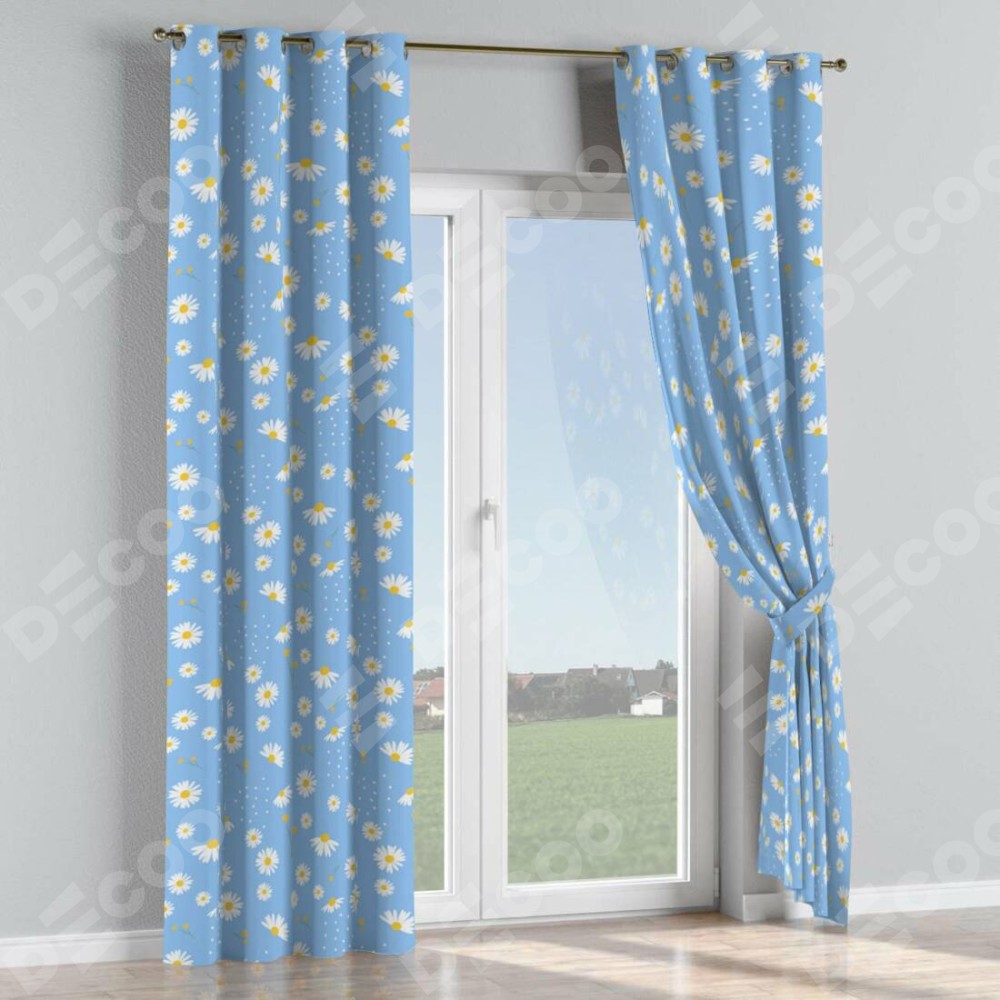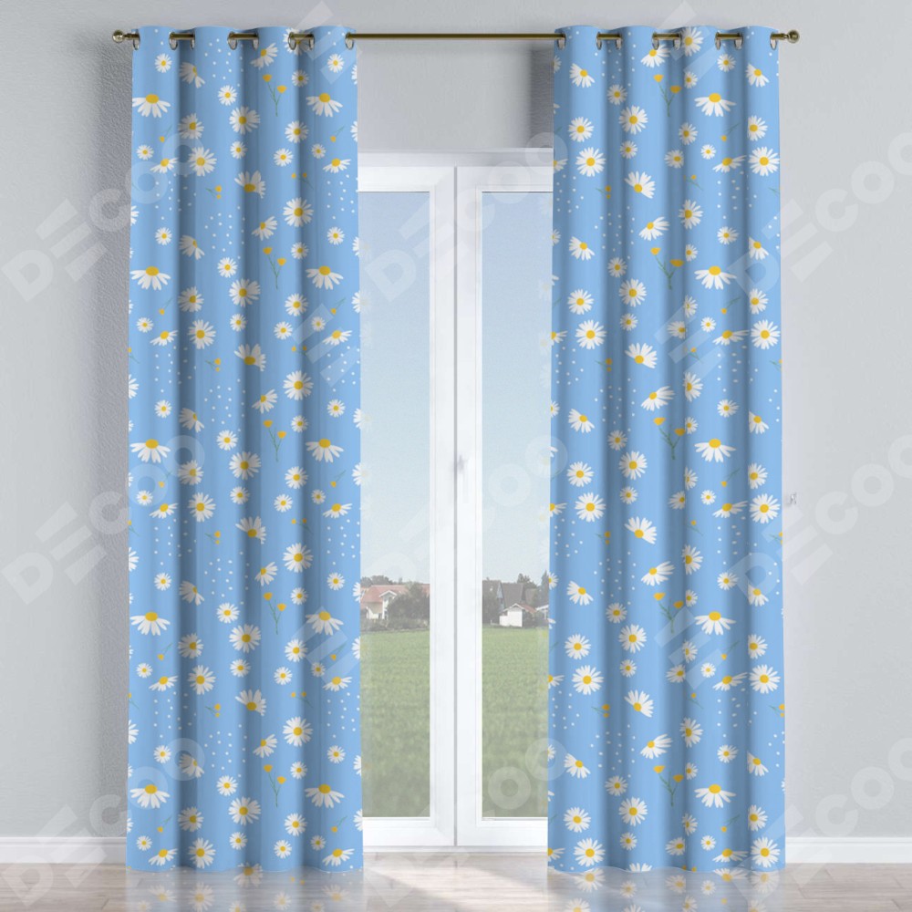 Комплект прямых штор, от производителя «Cortin», пошиты из ткани блэкаут с нанесением сублимационной печати «Ромашки на голубом». Данная модель пошита на люверсах, комплектуется на выбор круглым карнизом и подходит для монтажа на стену или потолок. Прямые шторы на люверсах шьются по стандарту с коэффициентом 1/2 (на 100 см. ширины проёма 200 см. ширины ткани), отличительным преимуществом данной модели является простой способ монтажа. Достаточно повесить ее на трубу и штора готова!