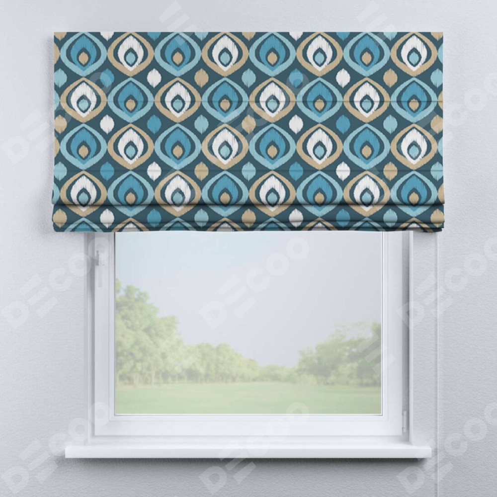Римская штора производителя «Cortin», используется для проёма, пошита из ткани блэкаут с нанесением сублимационной печати «Икат орнамент». Имеет универсальный механизм и подходит для монтажа: на потолок, на стену и в нишу.
