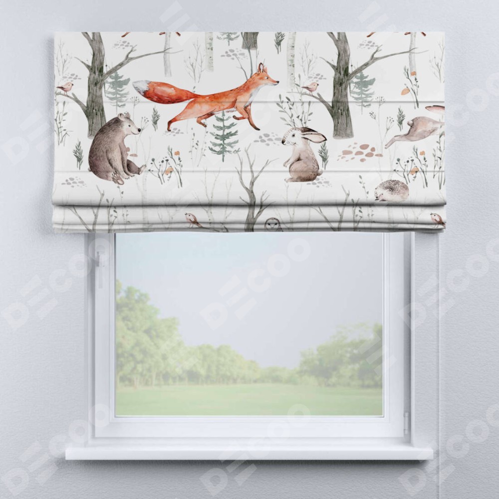 Римская штора производителя «Cortin», используется для проёма, пошита из ткани блэкаут с нанесением сублимационной печати «Лесной питомник». Имеет универсальный механизм и подходит для монтажа: на потолок, на стену и в нишу.