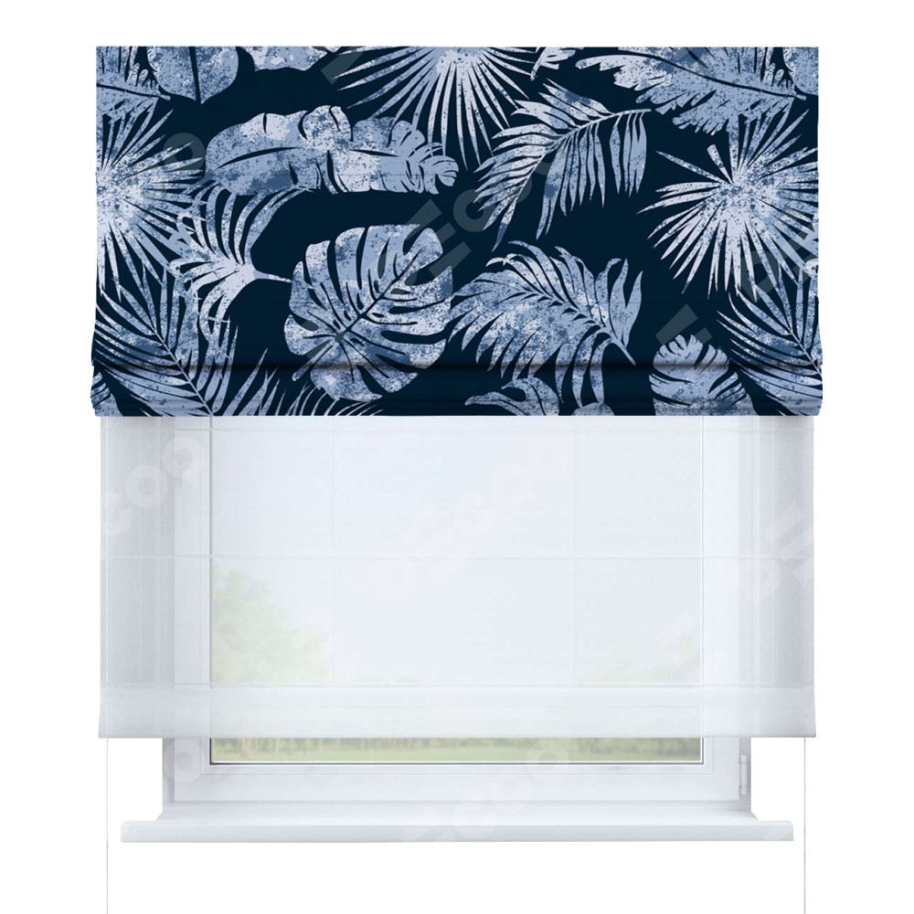 Римская штора день-ночь производителя «Cortin», используется для проёма, пошита из двух полотен, с лицевой блэкаут с нанесением сублимационной печати «Тропическая ночь», вторая ткань тюль (по стандарту комплектуется тюль белого цвета артикул V-01). Имеет универсальный механизм и подходит для монтажа: на потолок, на стену и в нишу.