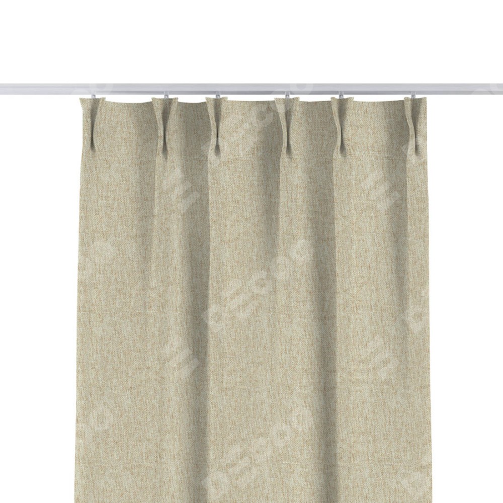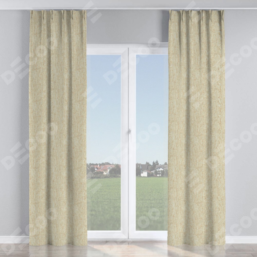 Комплект прямых штор, от производителя «Cortin», пошиты из ткани стиф димаут светло-бежевый, артикул ткани 18084. С изнаночной стороны в верхней части штор пристрачивается шторная лента с декоративными складками «Кустик». Для создания элегантных складок прямые шторы шьются по стандарту с коэффициентом 1:2 (на 100 см. ширины проёма 200 см. ширины ткани).